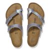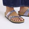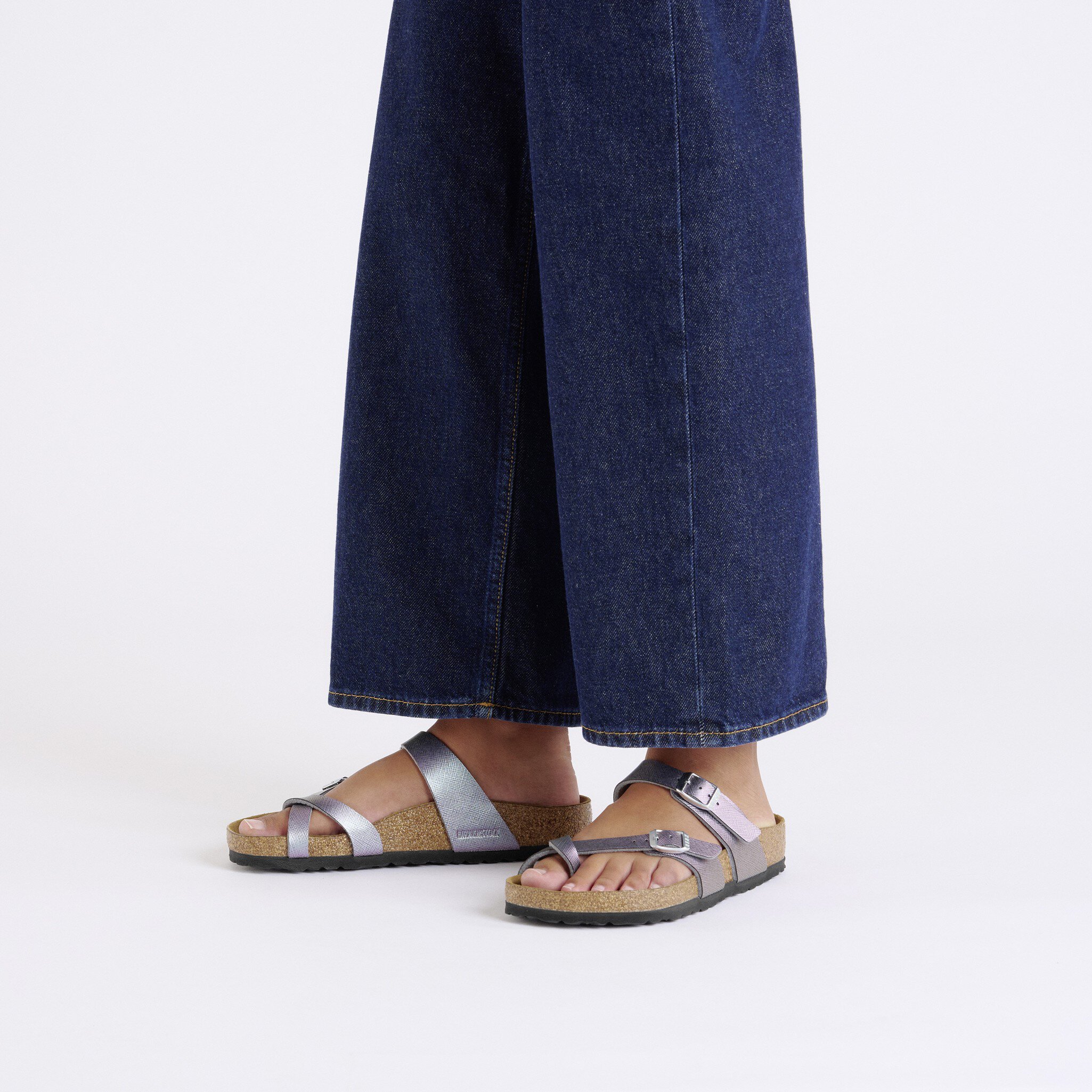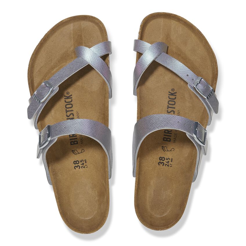 The BIRKENSTOCK Mayari thong sandal is a jaunty model with a toe loop. The impressive combination of design and wearability will see fashion-conscious men and women through the day with elegance and comfort. This version features an iridescent, silky sheen. The Saffiano embossing is reminiscent of the iconic crosshatch pattern familiar from luxury leather accessories. The upper is made from the skin-friendly, hard-wearing synthetic material Birko-Flor®, which has been embossed.