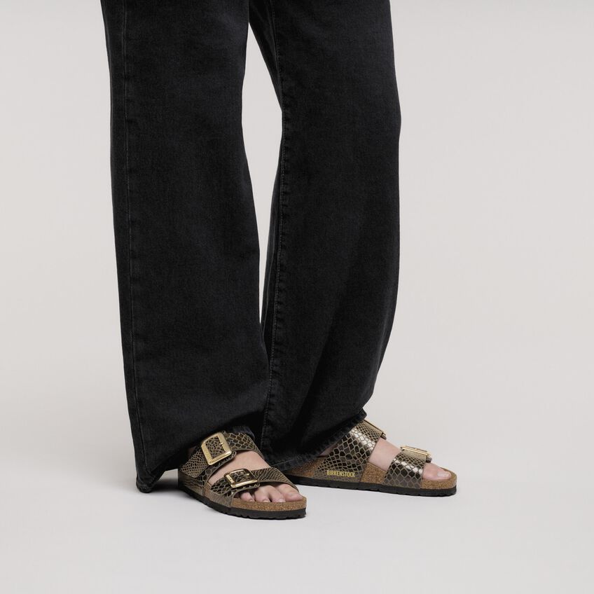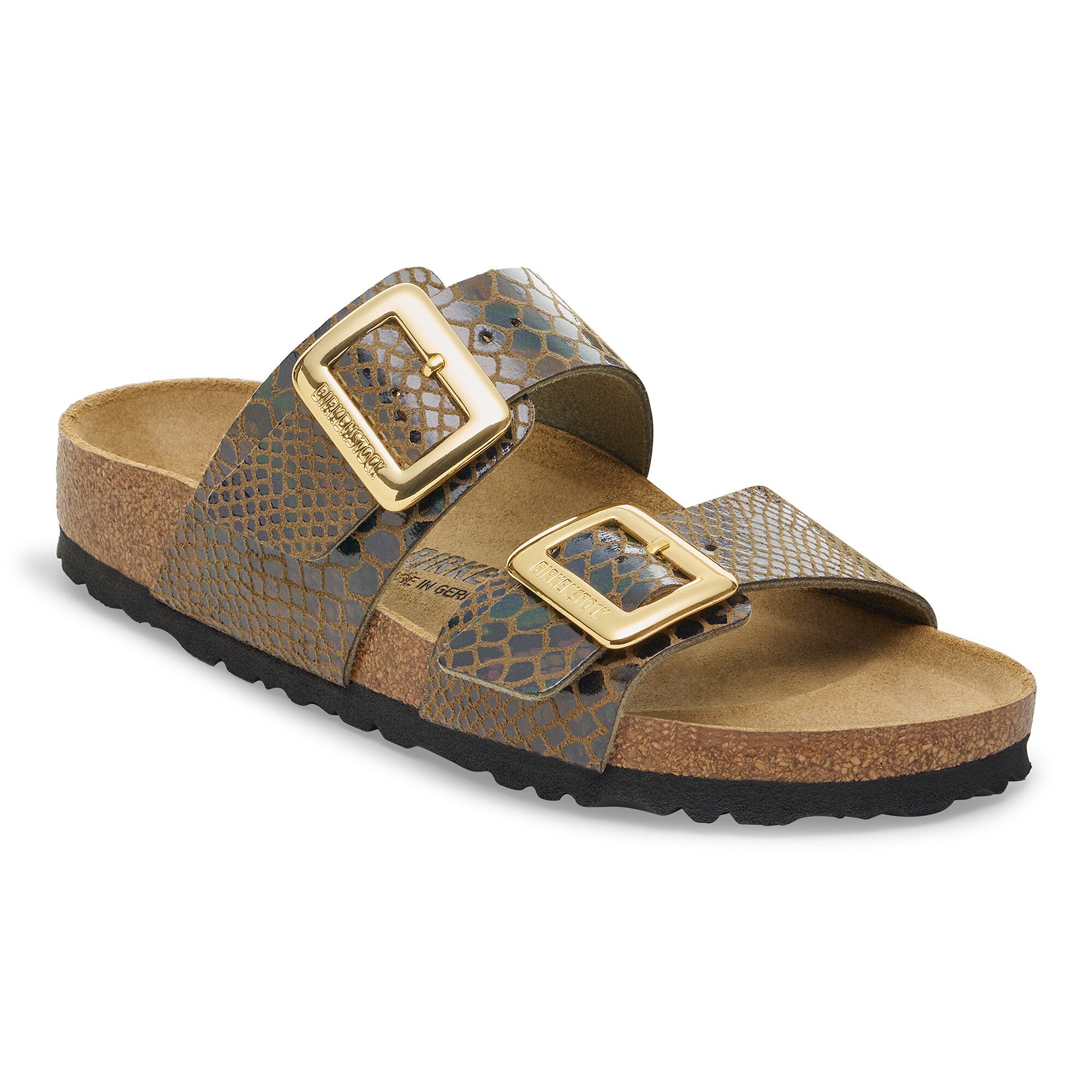The BIRKENSTOCK Sydney proves that fashion and functionality can go hand in hand. With its two simple straps, it’s a real hit with women who want both high fashion and comfort. This version comes in a shiny snake design and exudes elegance and a touch of extravagance thanks to the iridescent metallic foil and the snakeskin look. Inspired by nature, no two shoes have the same look and feel. The shiny, gently rounded padded buckles are especially eye-catching. The upper is made from a skin-friendly synthetic material.