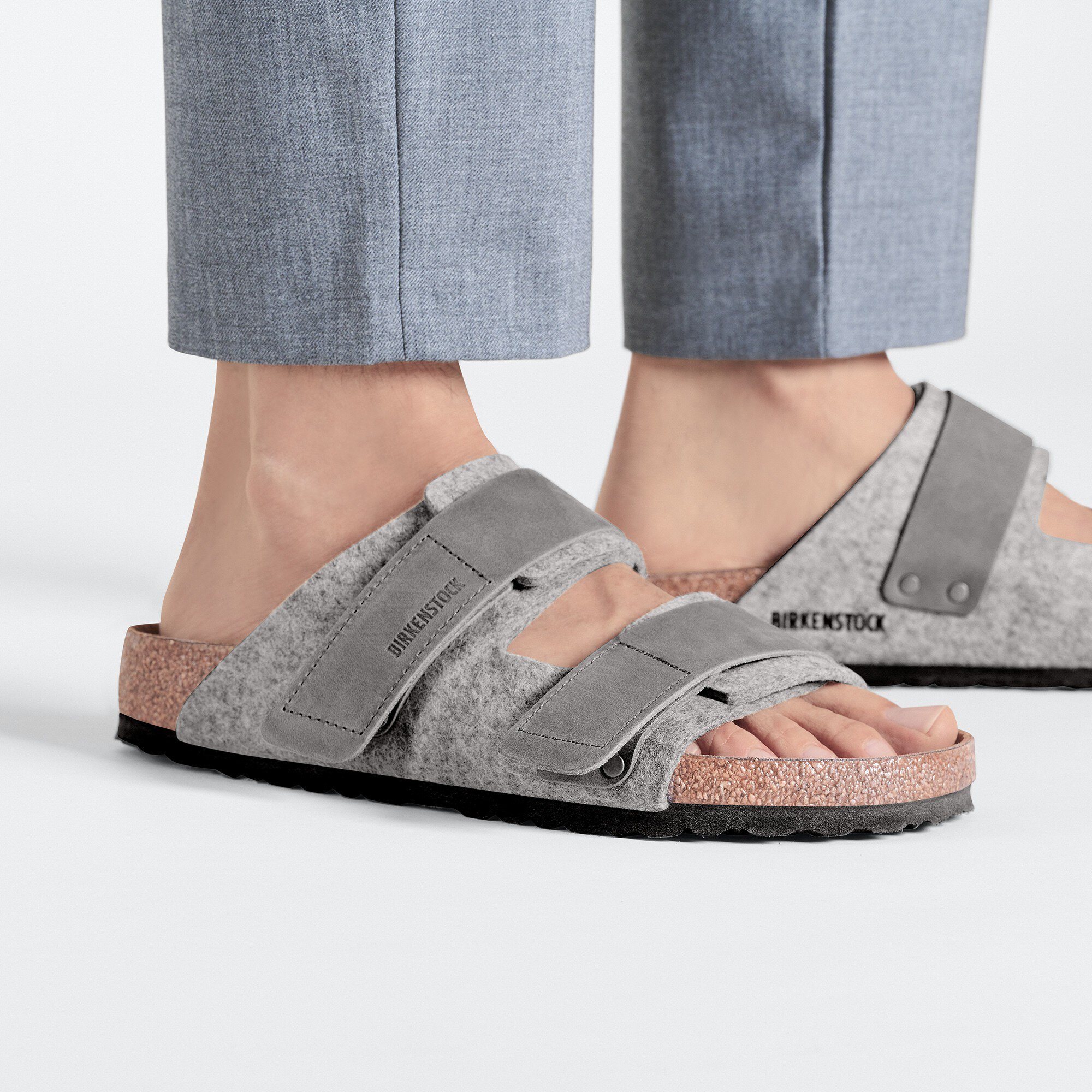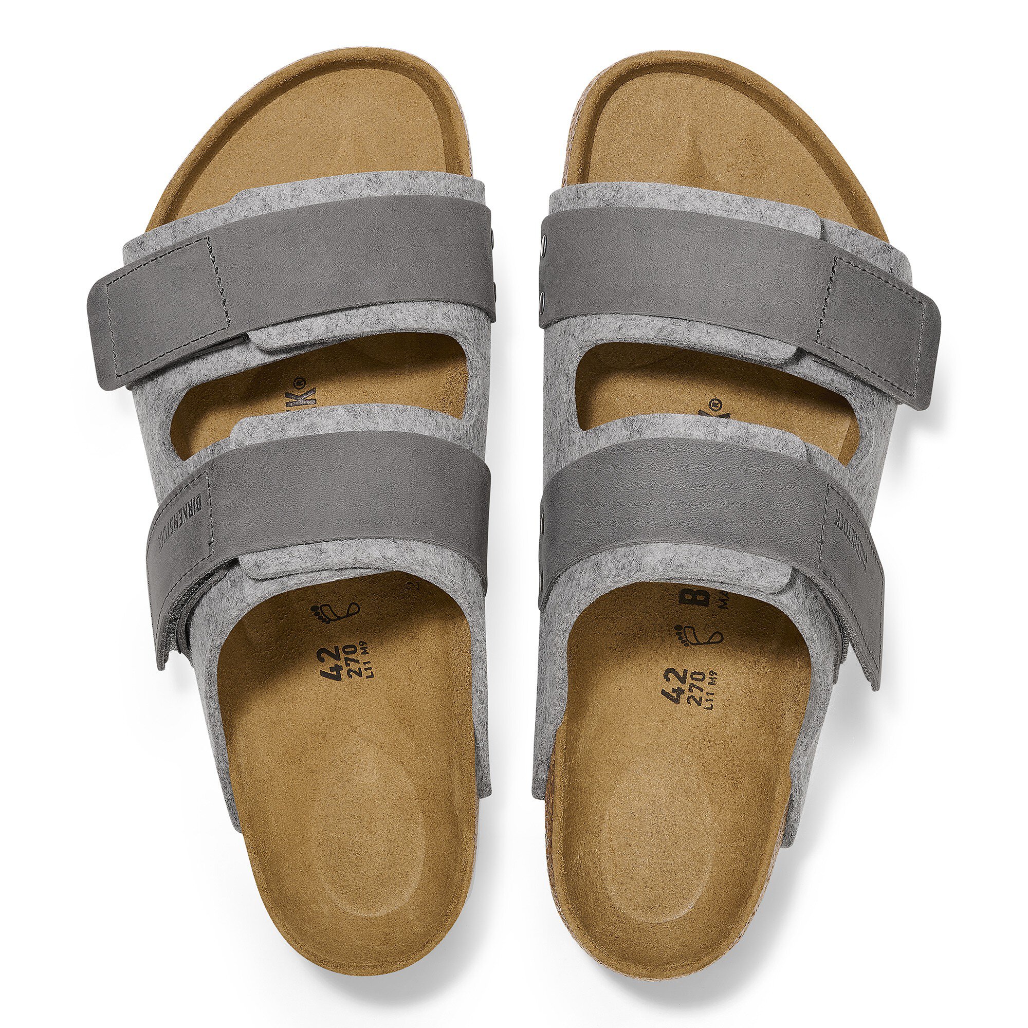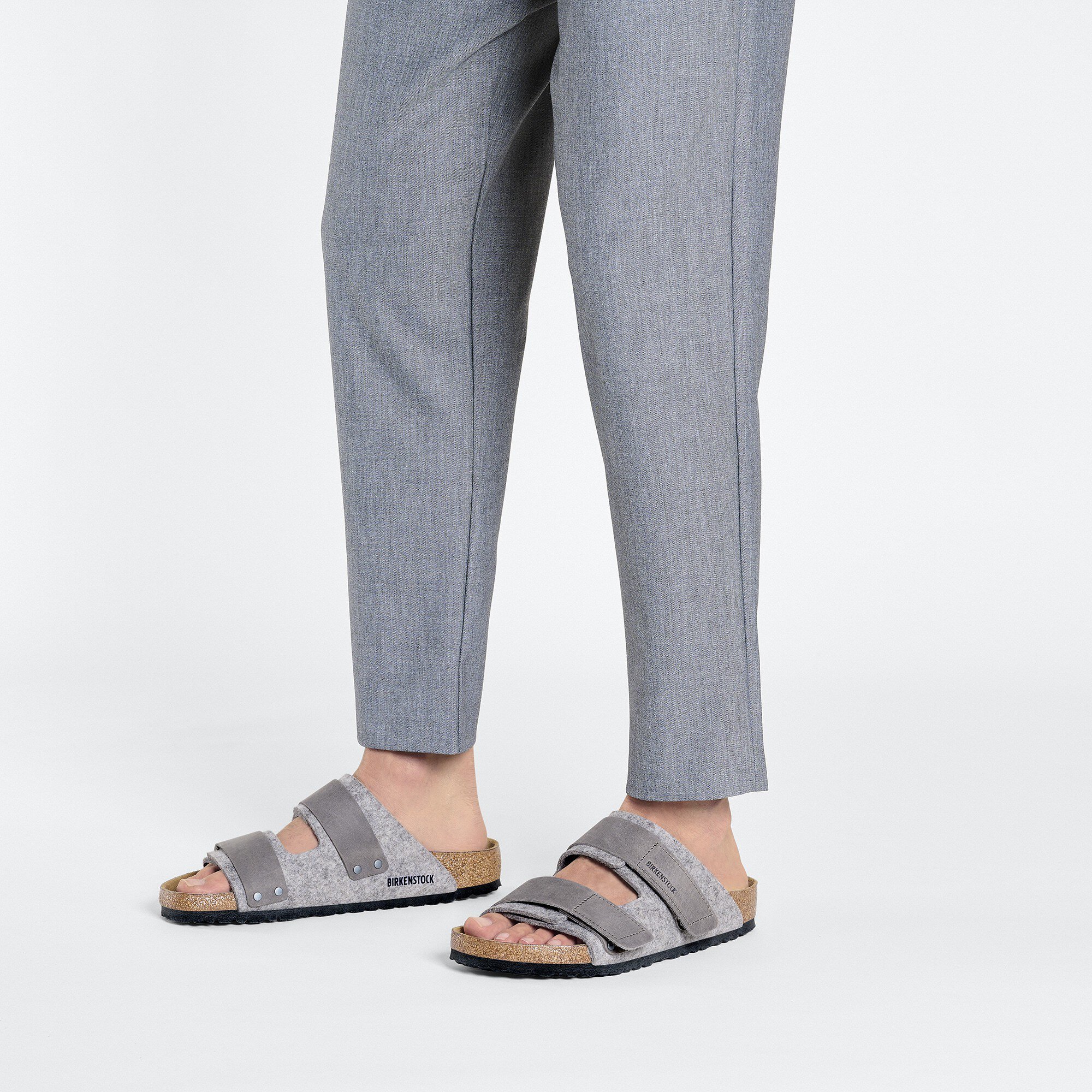The casual BIRKENSTOCK Uji is refreshingly sporty and stands out with its practical individually adjustable fasteners. It’s great for anyone who likes to combine sporty looks with their everyday outfits. This version boasts an authentic and rustic mix of materials featuring soft synthetic felt and thick natural leather.