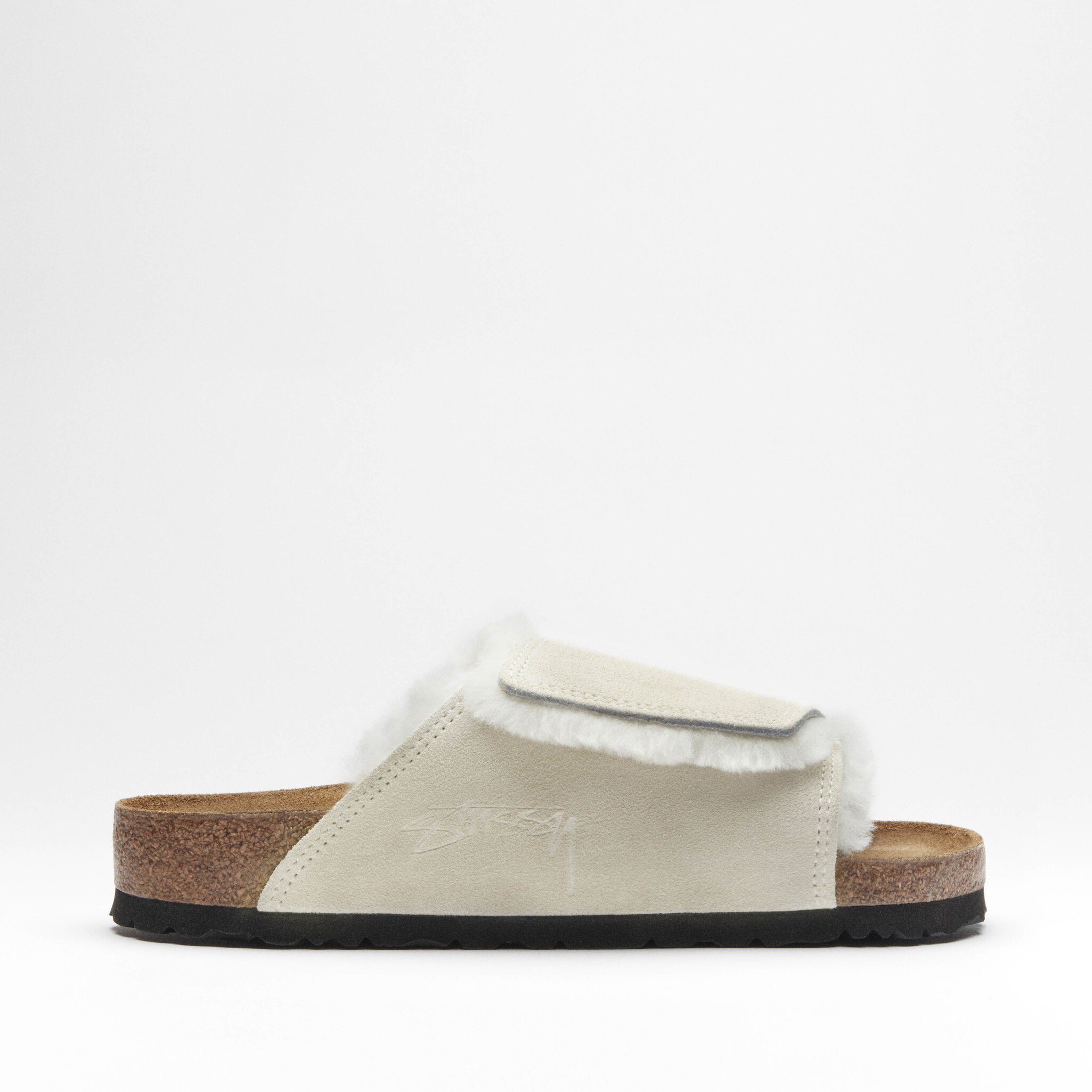 The BIRKENSTOCK x Stüssy Solana is crafted in suede and lined with extra-long shearling. It combines our famous anatomically designed footbed with our EVA outsole to create a silhouette that can be worn year-round. The Solana is available in three distinct colourways of bone, caramel and washed green with embossed Stüssy branding.