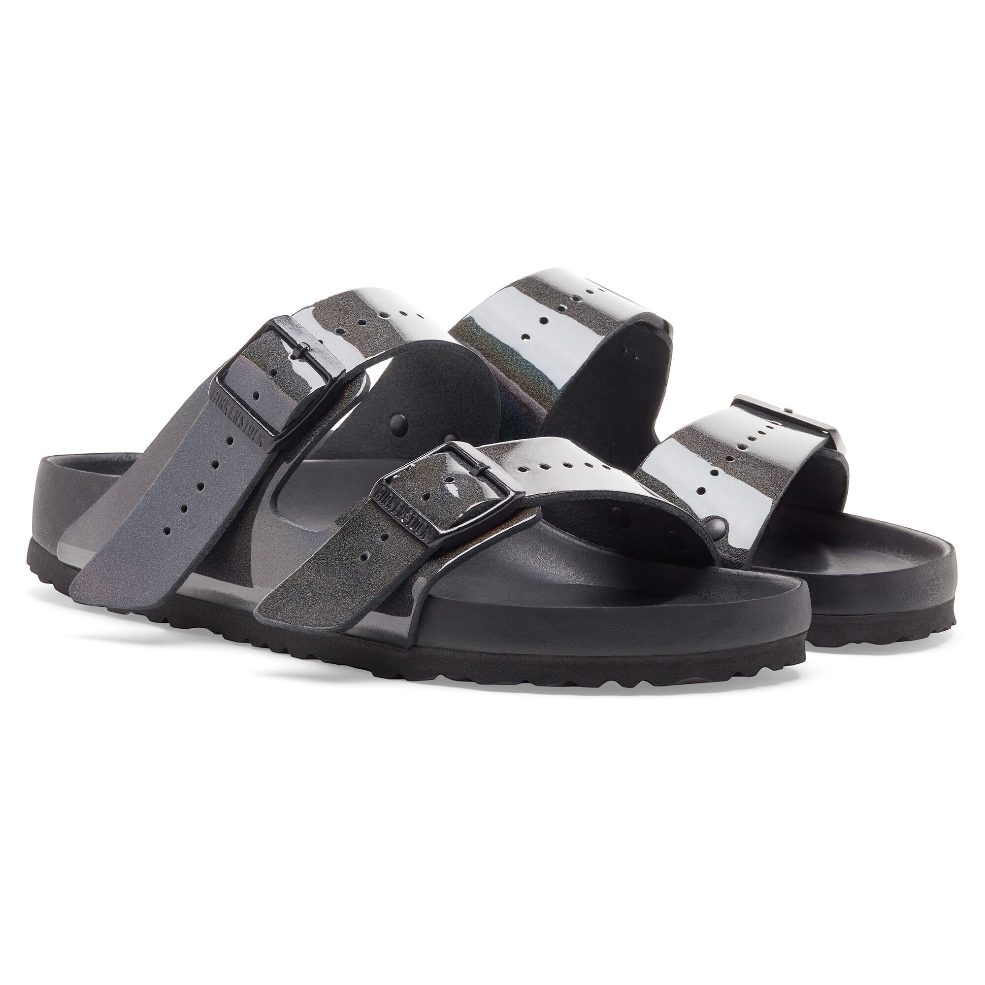 - Upper: smooth, soft leather on black styles and foiled leather on iridescent styles. All equipped with black rivets and buckles.