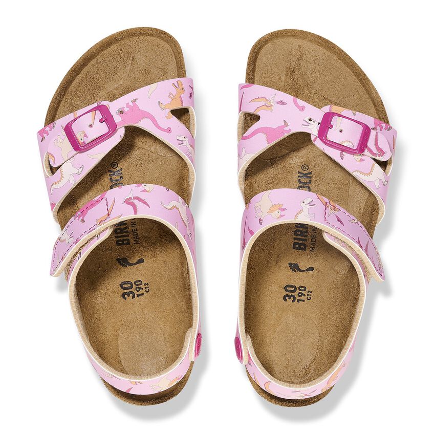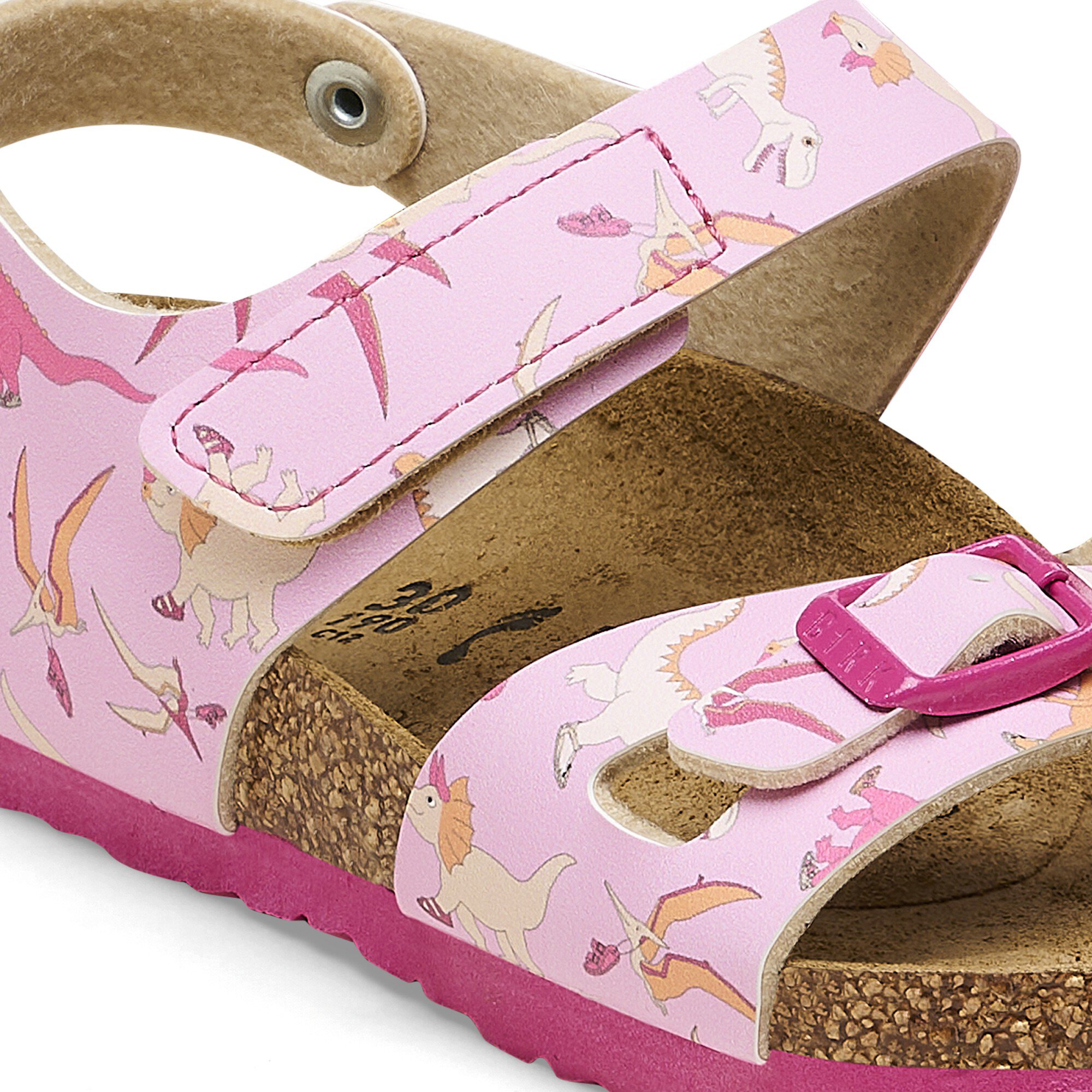 The BIRKENSTOCK Colorado is a variation on the classic Rio. The buckle at the ankle strap has been replaced by a hook-and-loop fastener, allowing it to be put on and taken off in an instant – perfect for kids’ impatient feet! This version of the sandal will set kids’ hearts racing. The colorful dinosaur print will put a smile on kids’ faces all day long. The color-coordinated details round off the shoe’s look of sophistication. The upper is made from the skin-friendly, hard-wearing synthetic material Birko-Flor®.