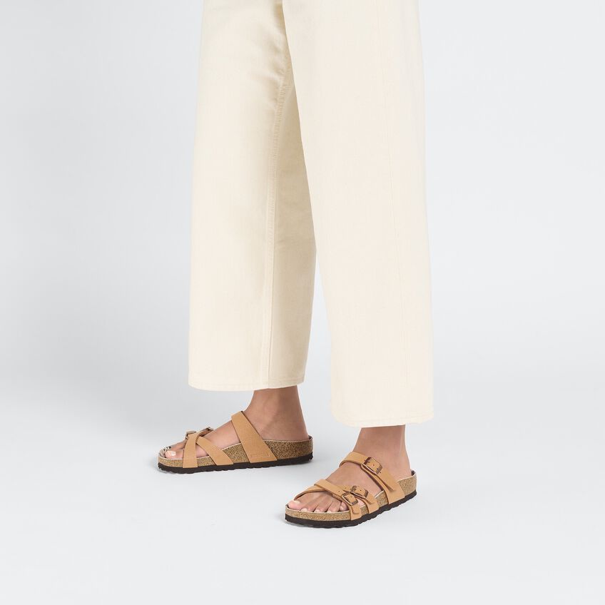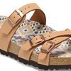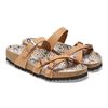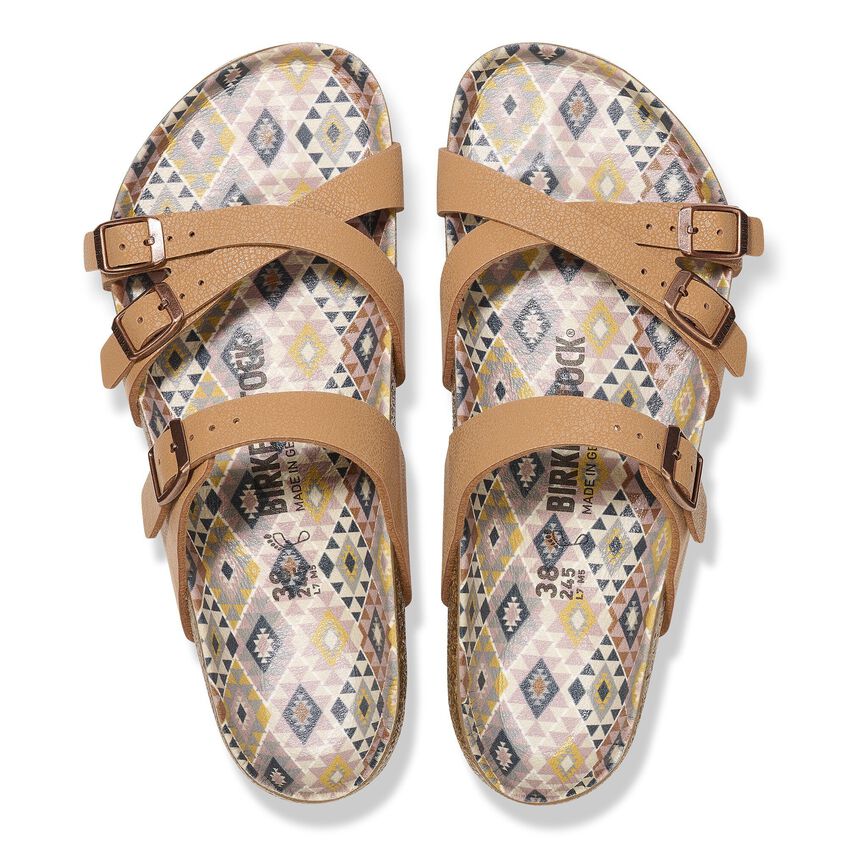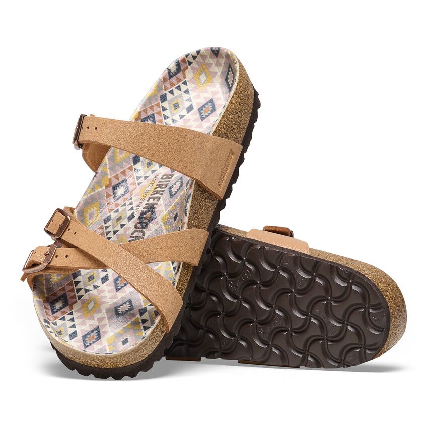 The BIRKENSTOCK Franca is a jaunty sandal with slim cross-over straps. This popular sandal has been given an update in a new material, with a vegan version now available. It is entirely free of animal products, as verified by independent testing laboratories. This version features an ethnic print on the footbed. Perfect for modern boho styles! The upper is made from the skin-friendly, hard-wearing synthetic material Birko-Flor® in a sophisticated nubuck look that could almost be mistaken for real leather.