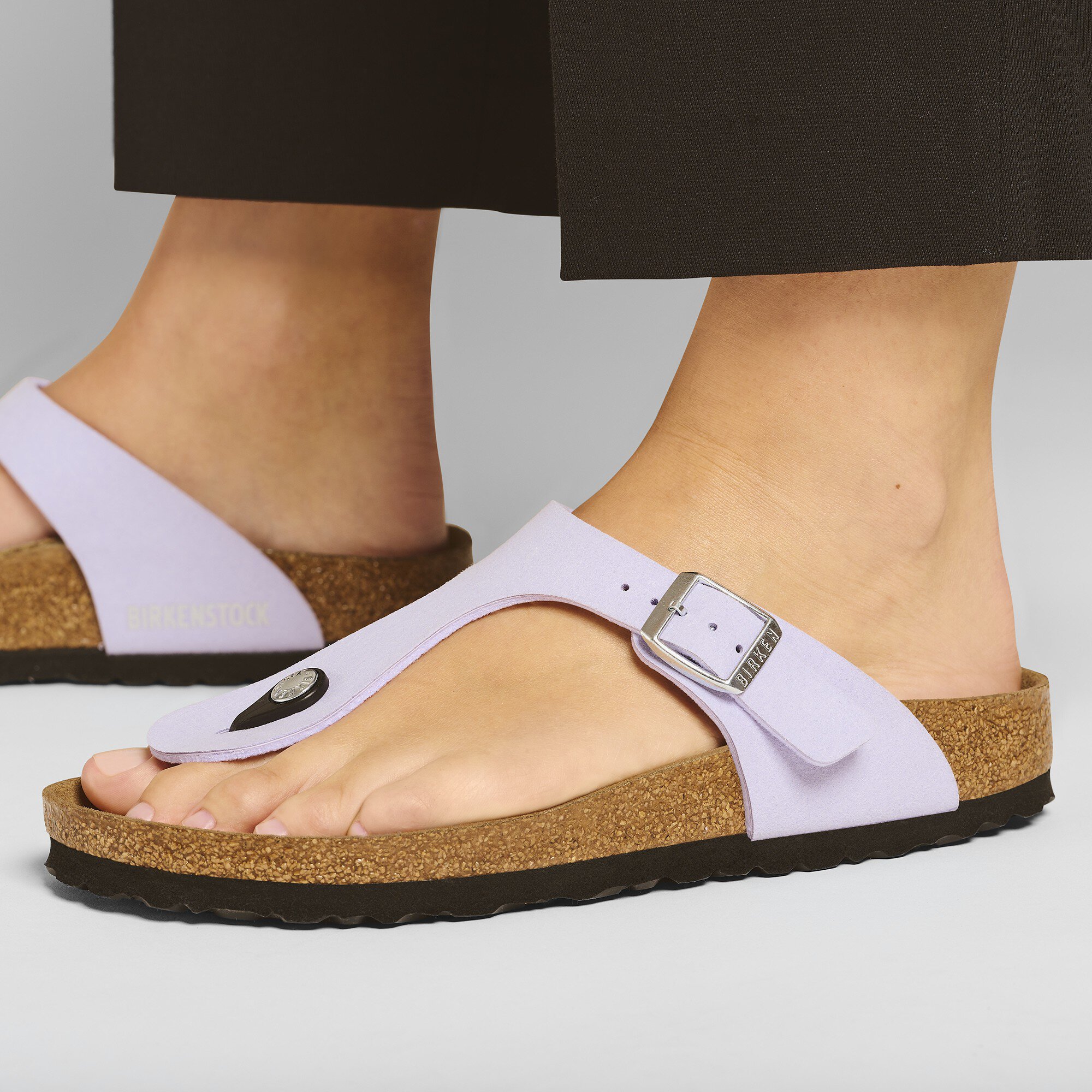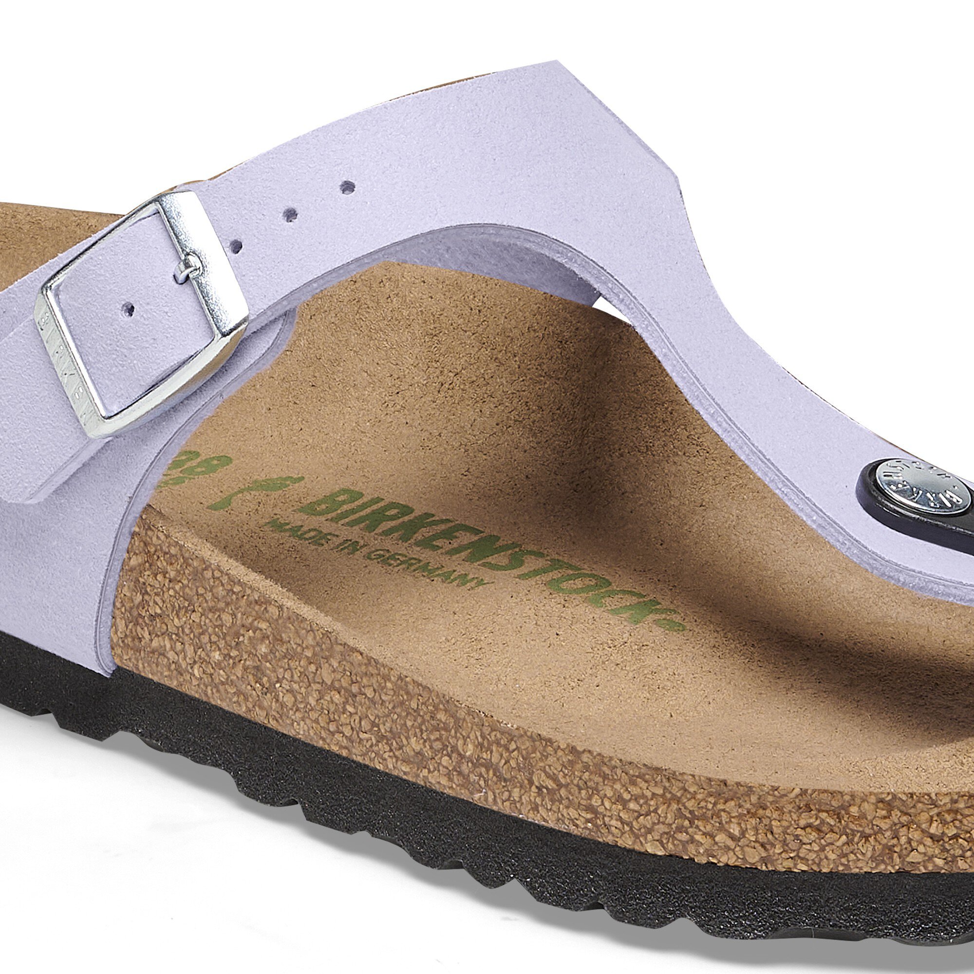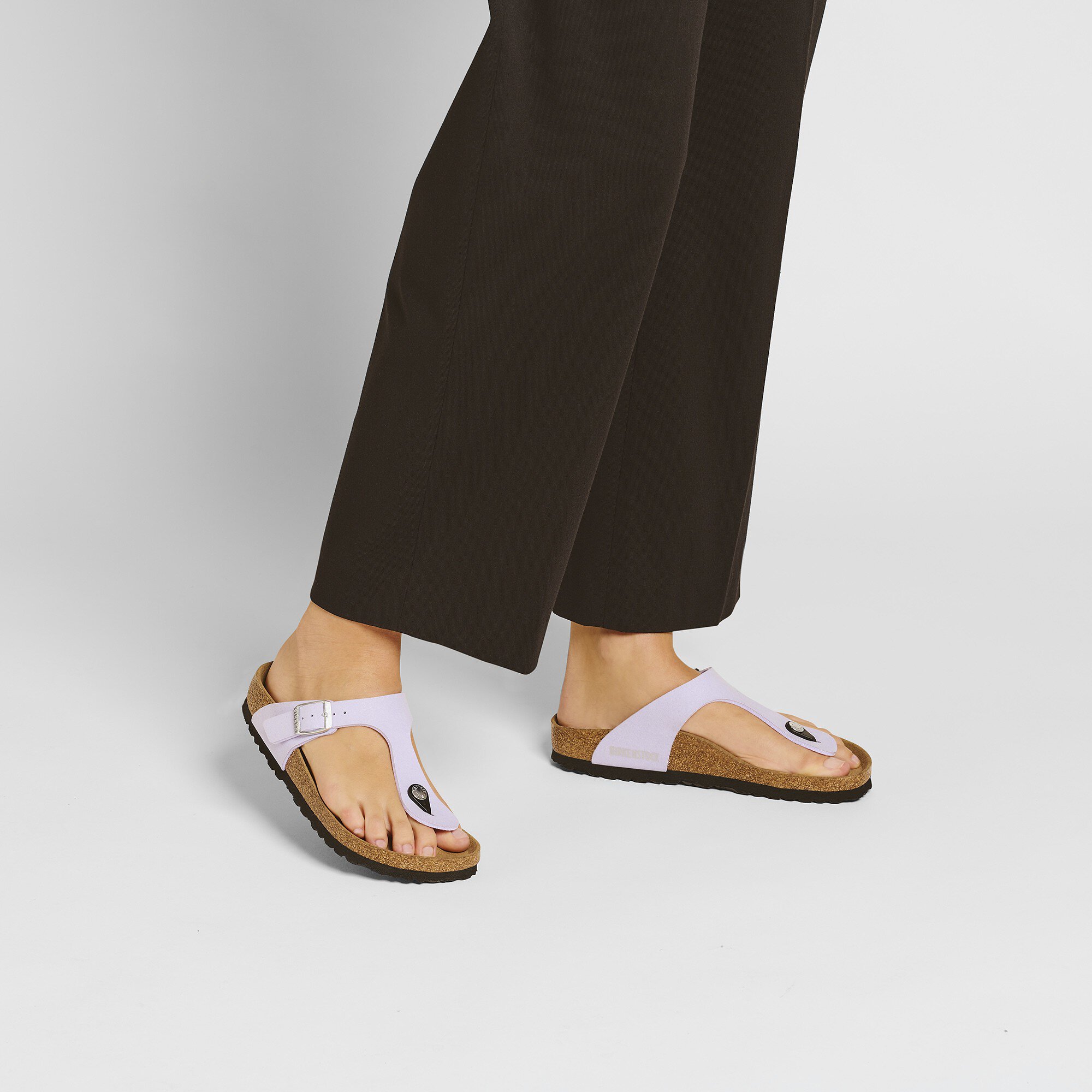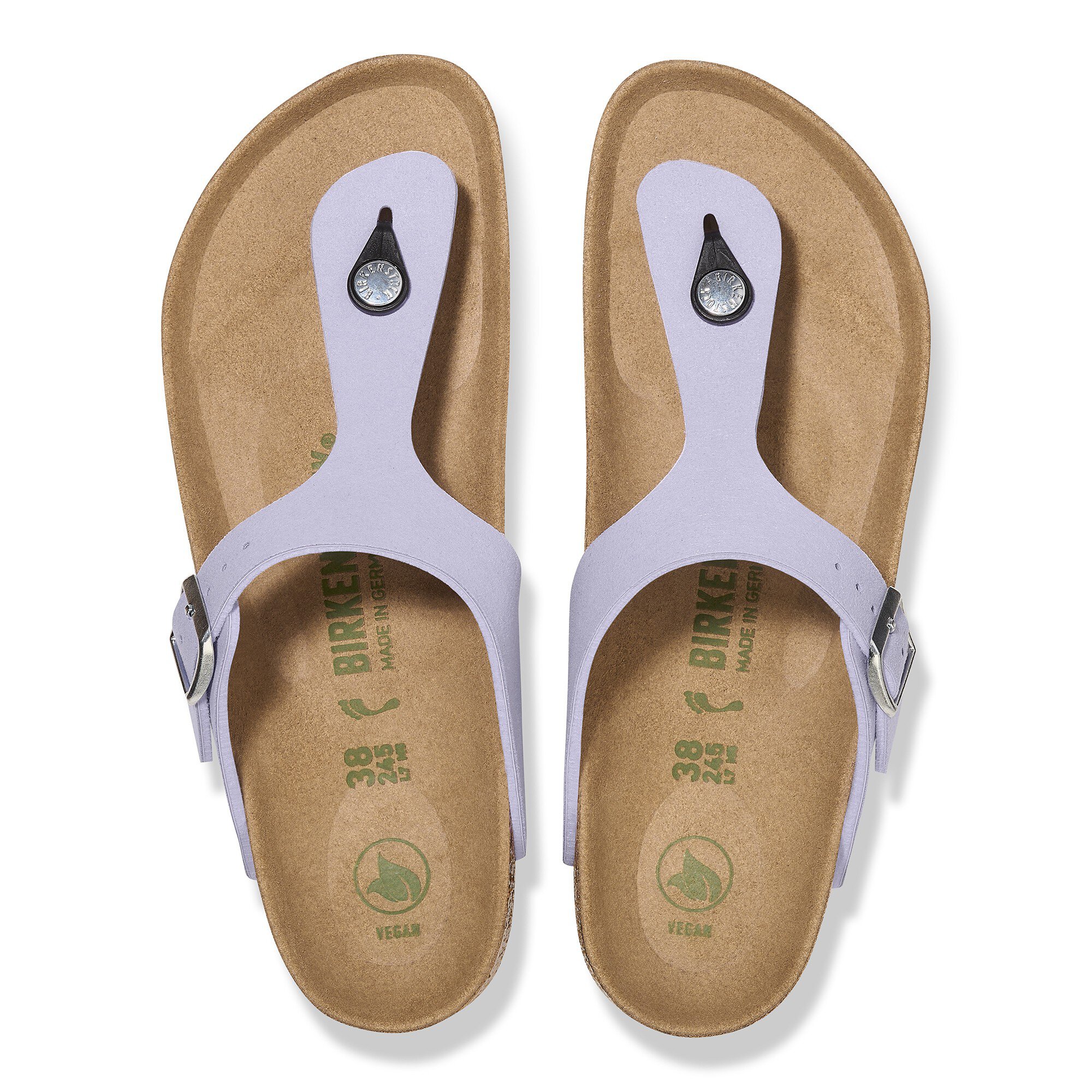 The BIRKENSTOCK Gizeh is a genuine classic that combines optimum grip with minimalist, fashionable design. This popular sandal has been given an update in a new material, with a vegan version now available. It is entirely free of animal products, as verified by independent testing laboratories. The upper is made from a skin-friendly,  synthetic material with a velvety feel.