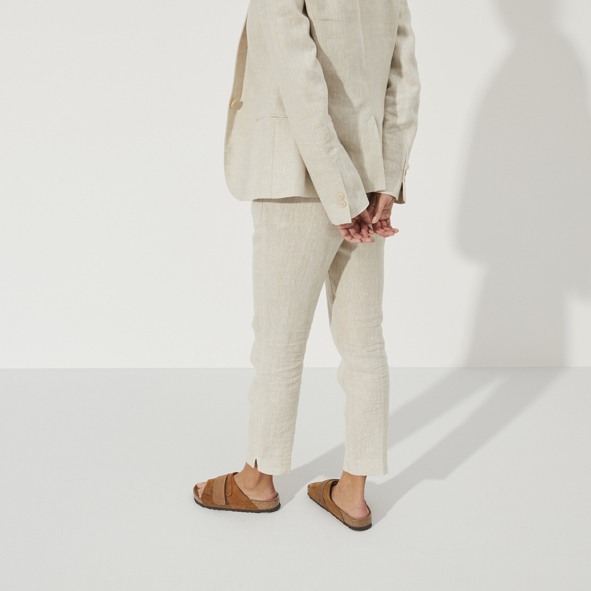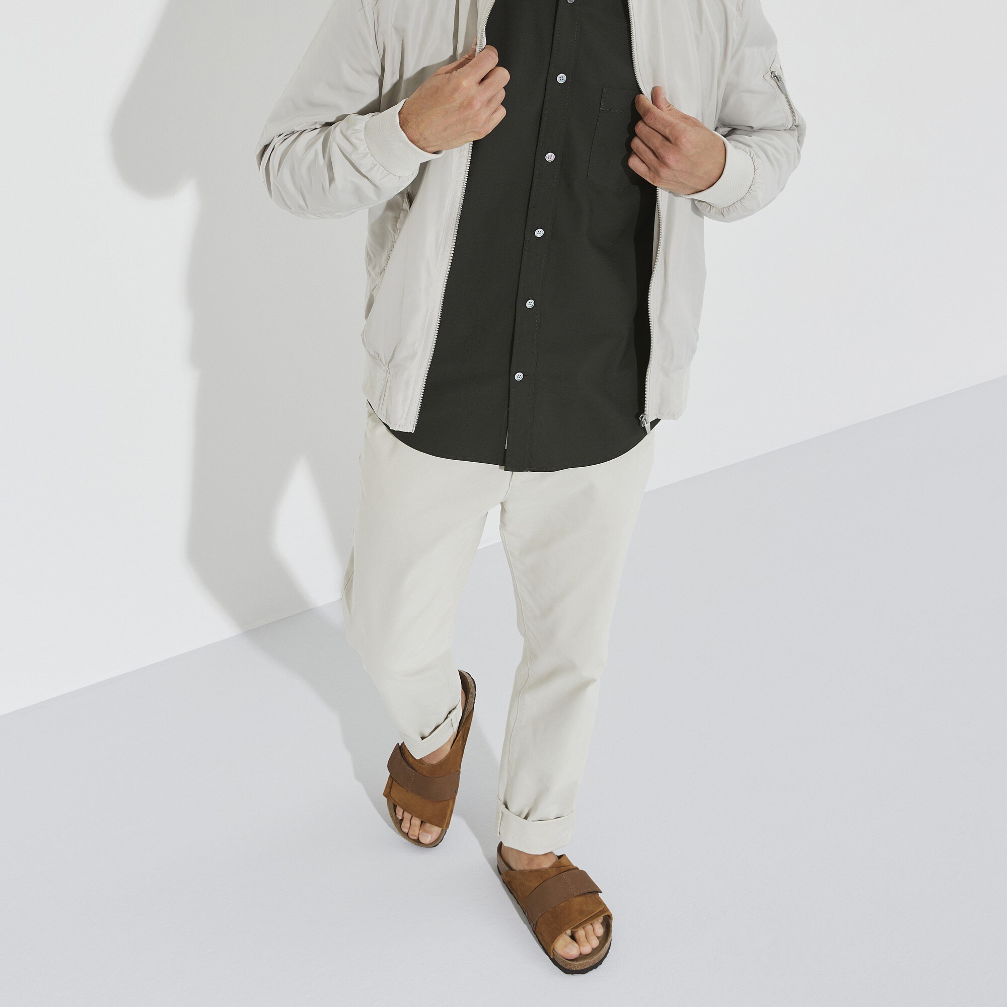 The casual BIRKENSTOCK Kyoto takes its inspiration from the classic Zürich model and stands out with its compact design and individually adjustable buckle. This offers optimum grip and is complemented by two decorative rivets. The upper is made from especially soft suede which hugs the foot like a second skin combined with high-quality nubuck leather.