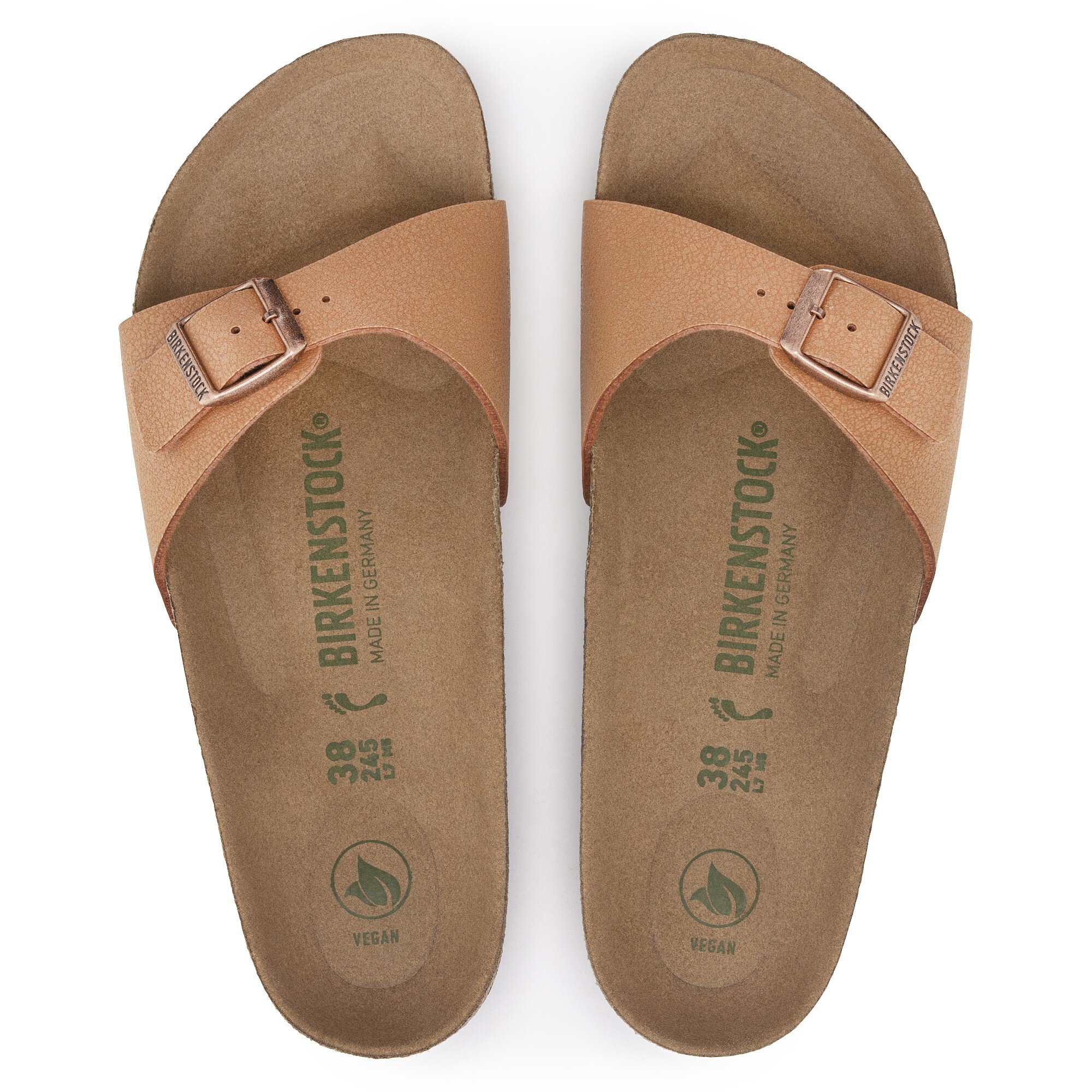 The BIRKENSTOCK Madrid is a genuine classic that delights the world of fashion with its minimalist design. This popular sandal has been given an update in a new material, with a vegan version now available. It is entirely free of animal products, as verified by independent testing laboratories. The upper is made from the skin-friendly, hard-wearing synthetic material Birko-Flor® in a sophisticated nubuck look which boasts a texture and color that could almost be mistaken for real leather.