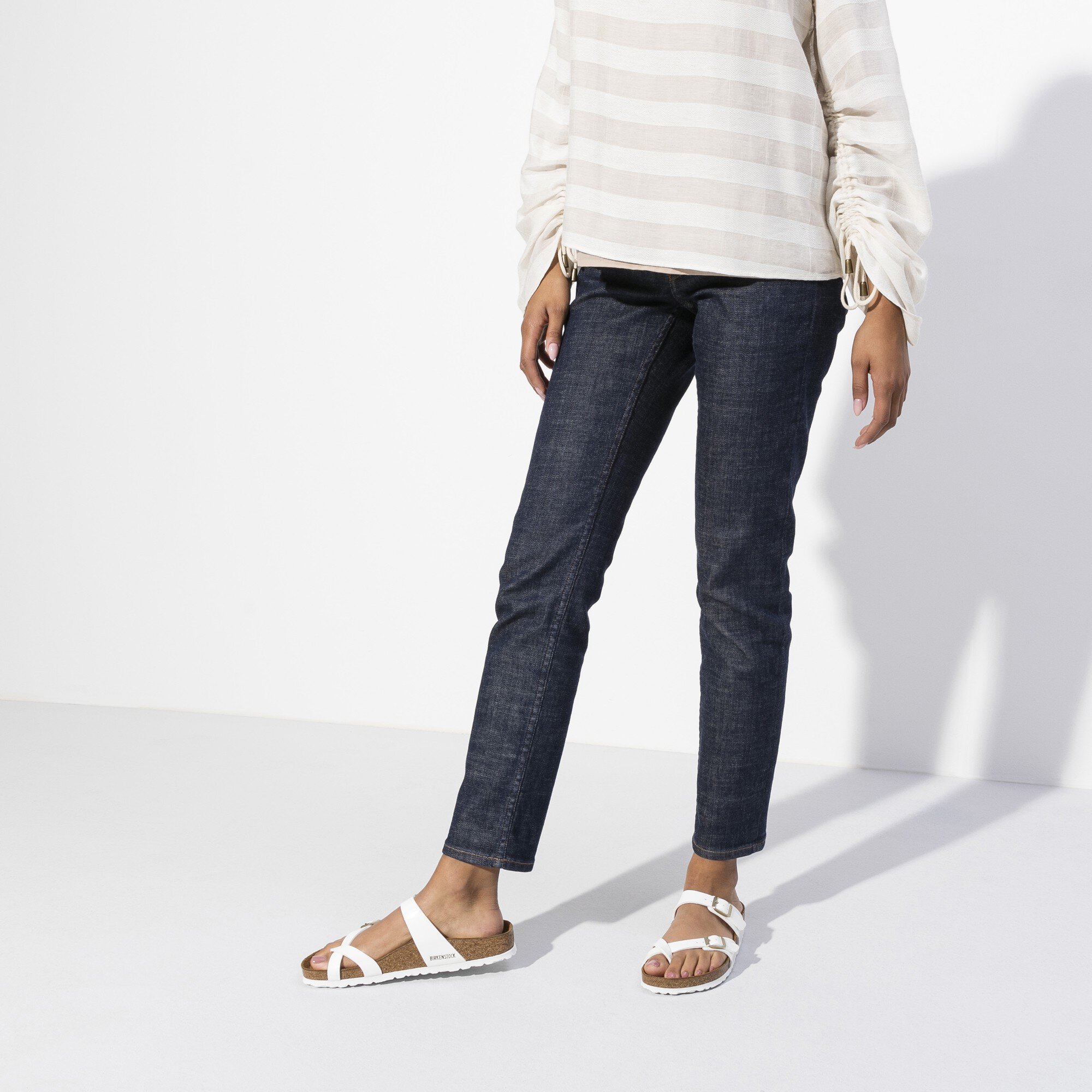 Jaunty and modern! The BIRKENSTOCK Mayari thong sandal stands out with its flowing look and brings together design and comfort. The upper is made from the skin-friendly, hard-wearing synthetic material Birko-Flor® with a shiny patent coating.