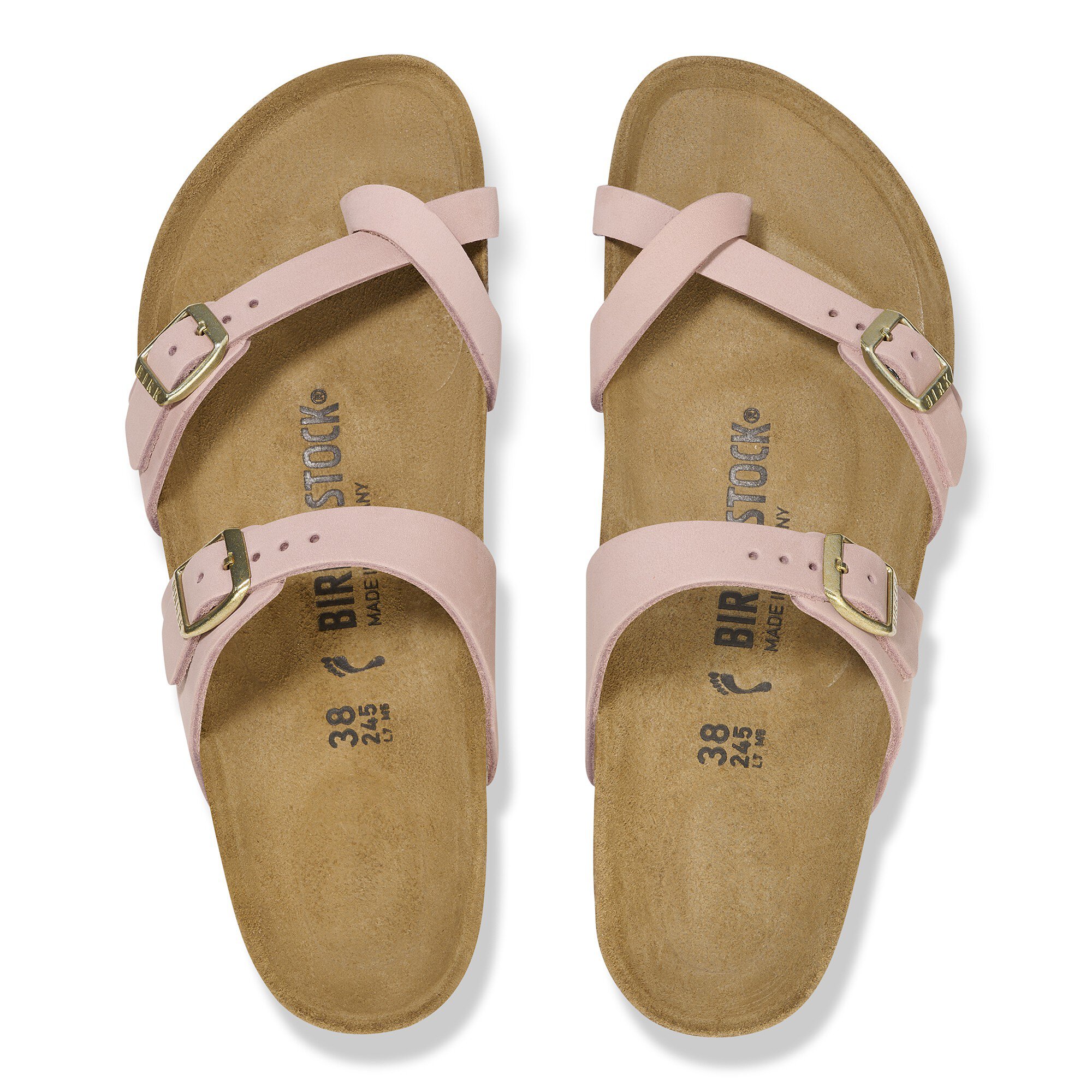 - Jaunty and modern! The BIRKENSTOCK Mayari thong sandal stands out with its flowing look and brings together design and comfort. With its additional foam layer, the soft footbed offers extra comfort and pampers feet – all day long. The upper is made from high-quality, soft nubuck leather that boasts a natural, rustic appearance.