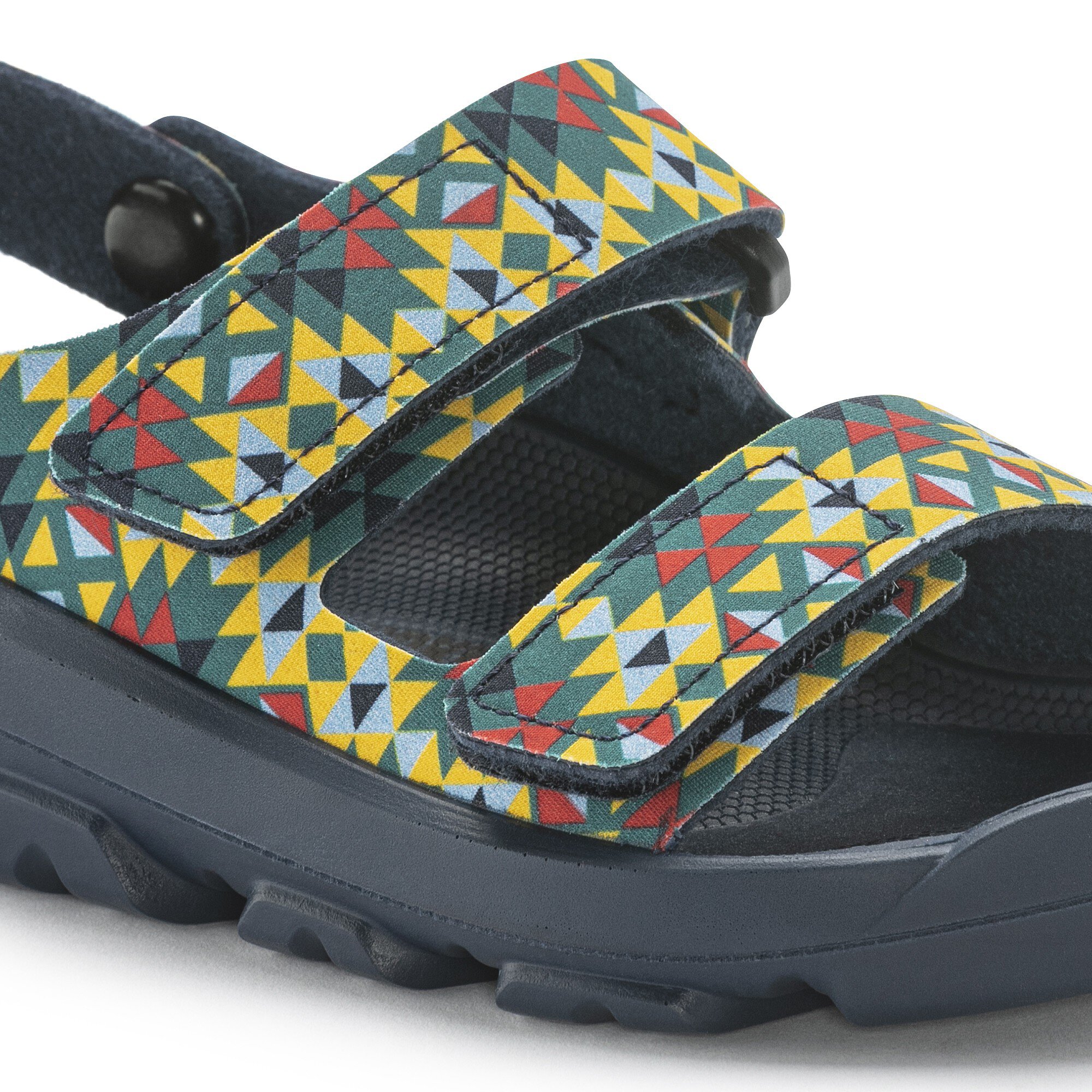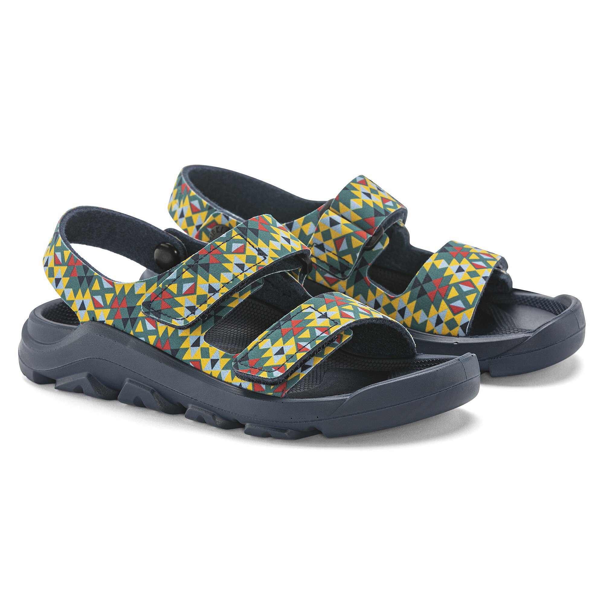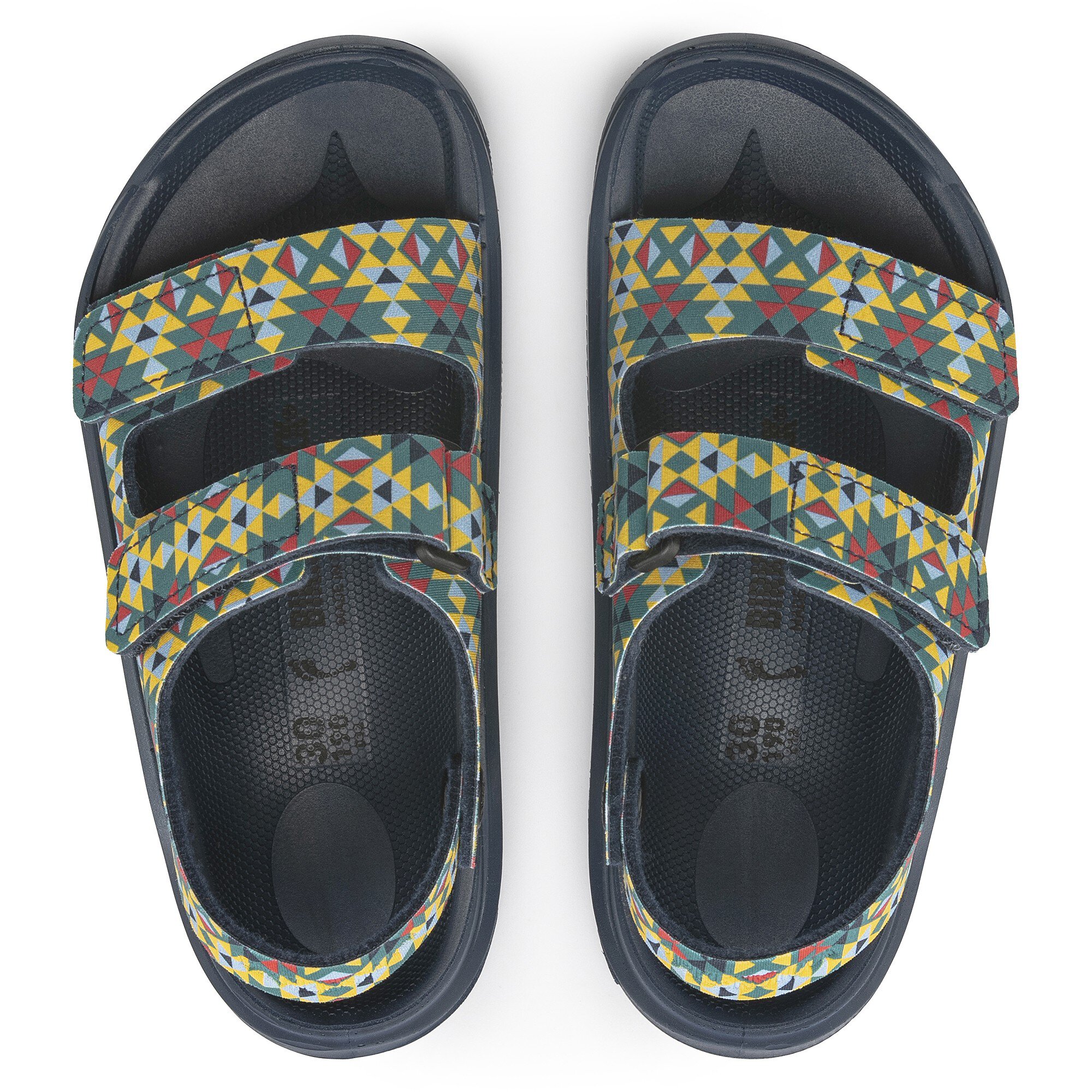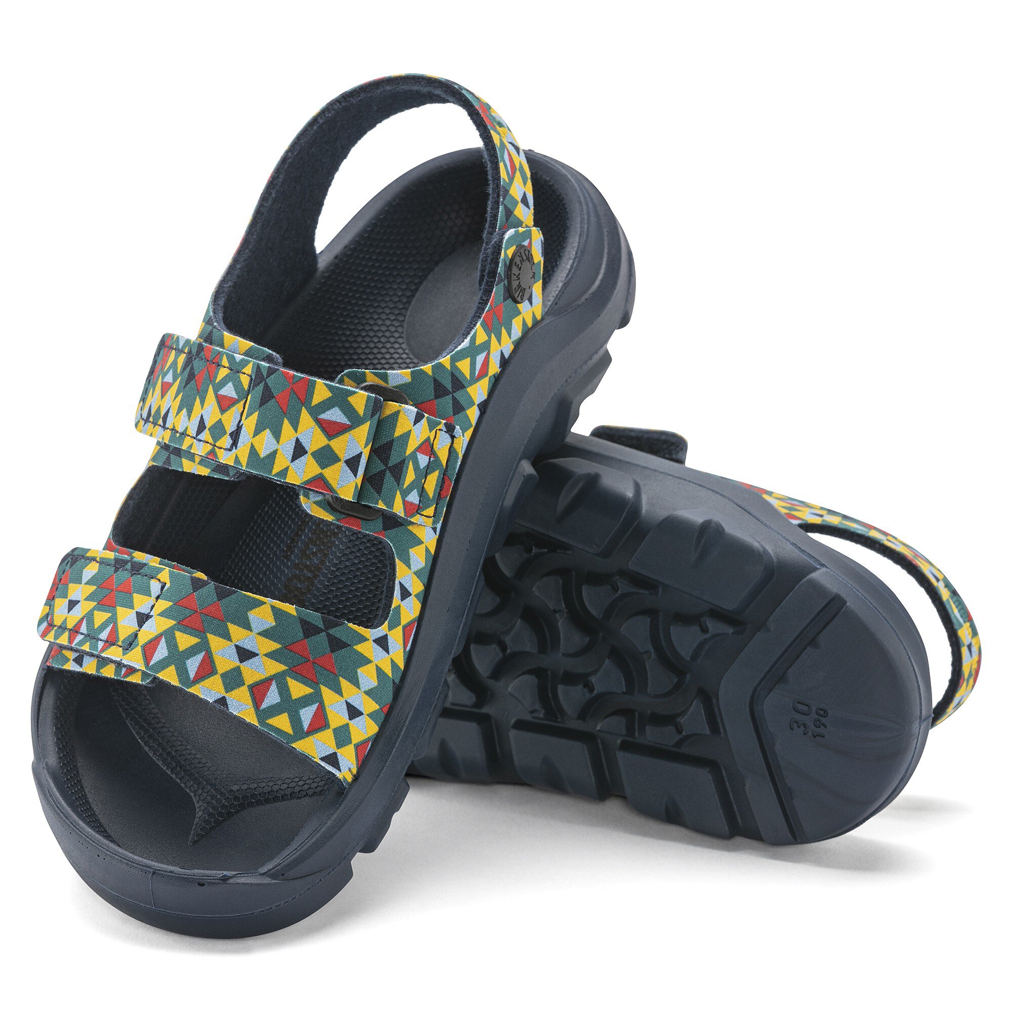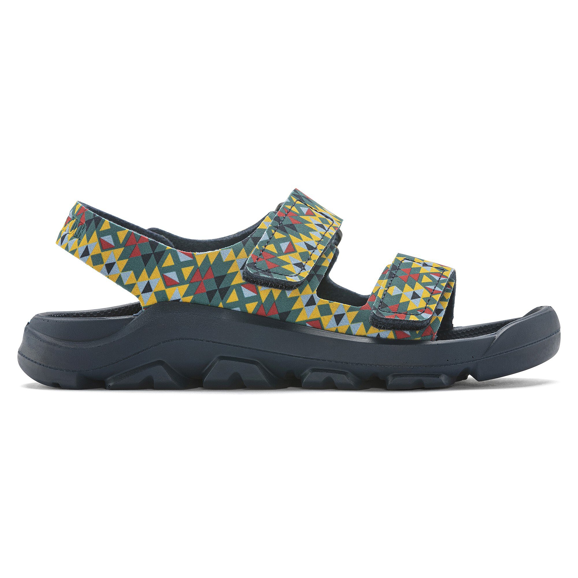 The perfect sandal for the playground, exploring forests, running across meadows, and jumping into puddles! With the BIRKENSTOCK Mogami, kids are more than ready for small and big adventures thanks to its waterproof footbed and the highly functional sole. The hook-and-loop fasteners make family excursions less stressful with their easy handling. They also ensure that the sandals remain on the feet – even during boisterous play! This version features a geometric print. The upper is made from a skin-friendly synthetic material comprising hard-wearing elastane lined with felt. It absorbs hardly any moisture and dries quickly.