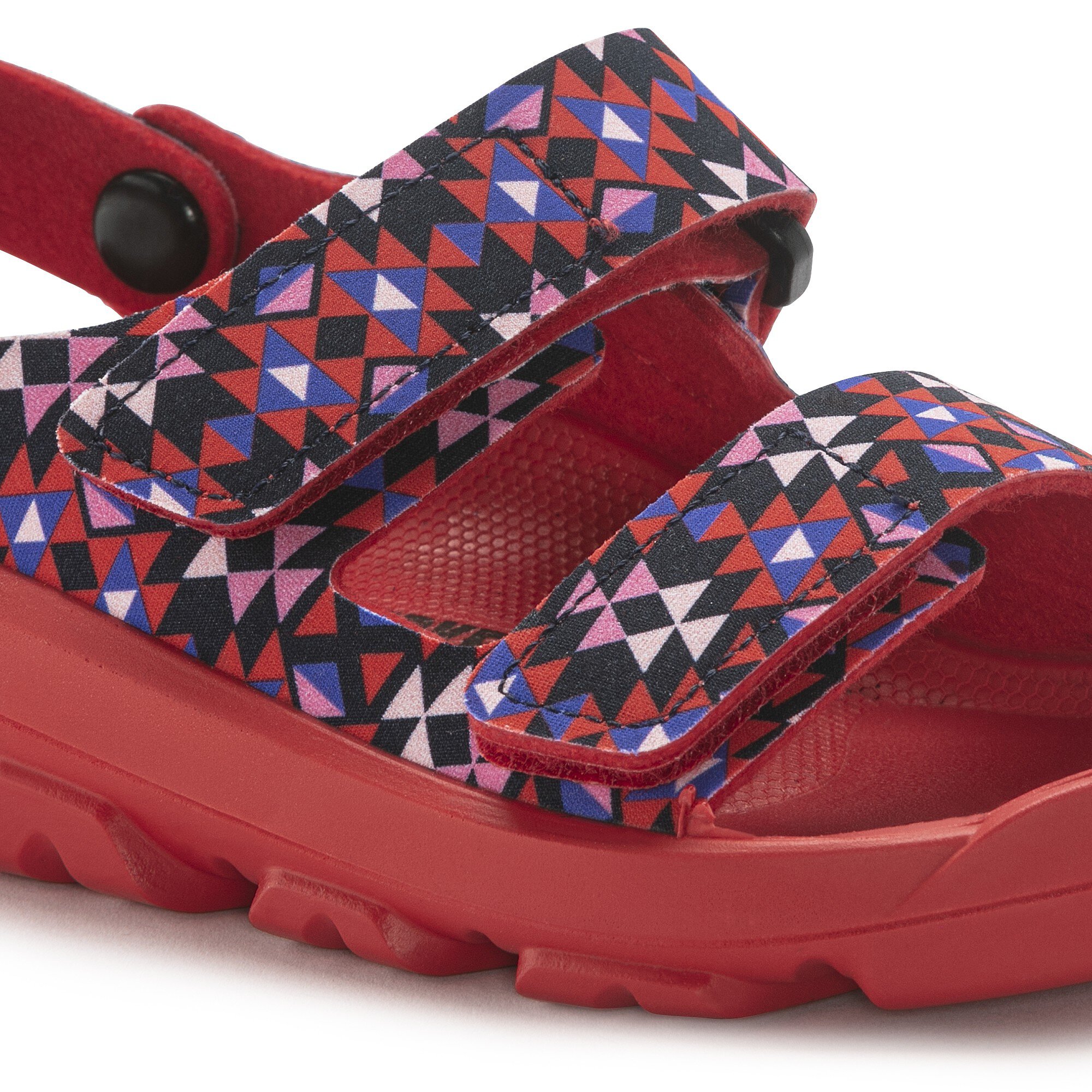 The perfect sandal for the playground, exploring forests, running across meadows, and jumping into puddles! With the BIRKENSTOCK Mogami, kids are more than ready for small and big adventures thanks to its waterproof footbed and the highly functional sole. The hook-and-loop fasteners make family excursions less stressful with their easy handling. They also ensure that the sandals remain on the feet – even during boisterous play! This version features a geometric print. The upper is made from a skin-friendly synthetic material comprising hard-wearing elastane lined with felt. It absorbs hardly any moisture and dries quickly.