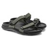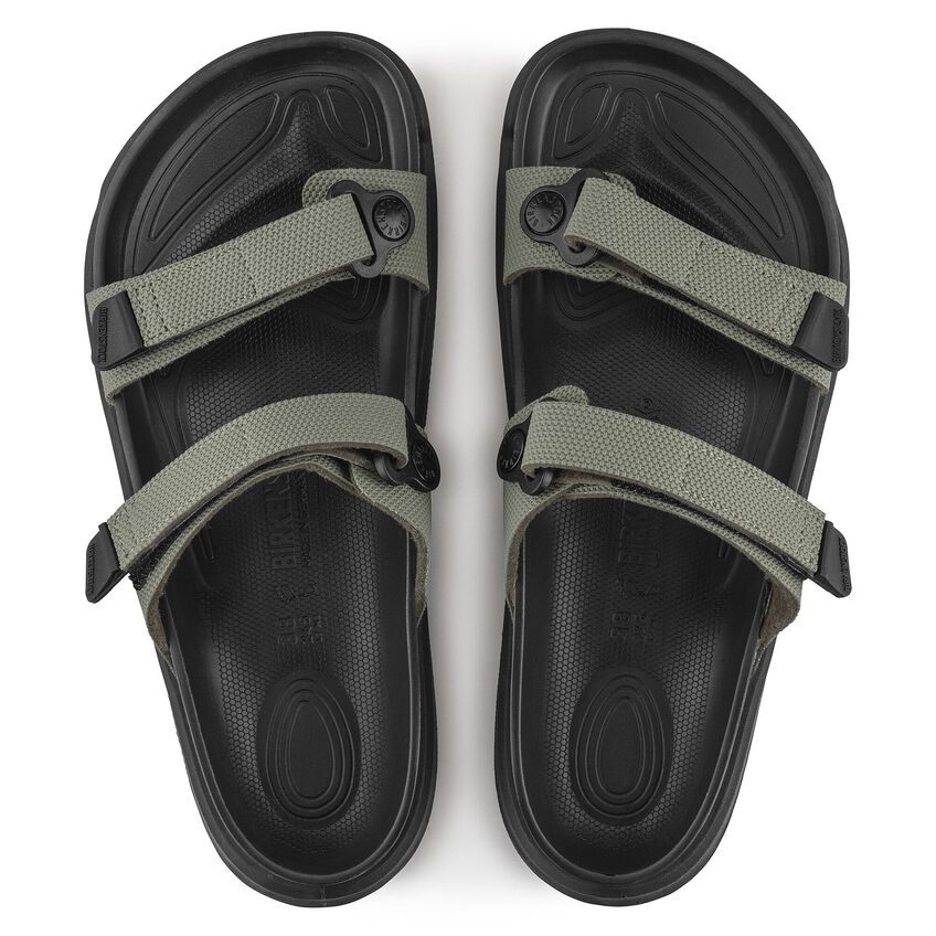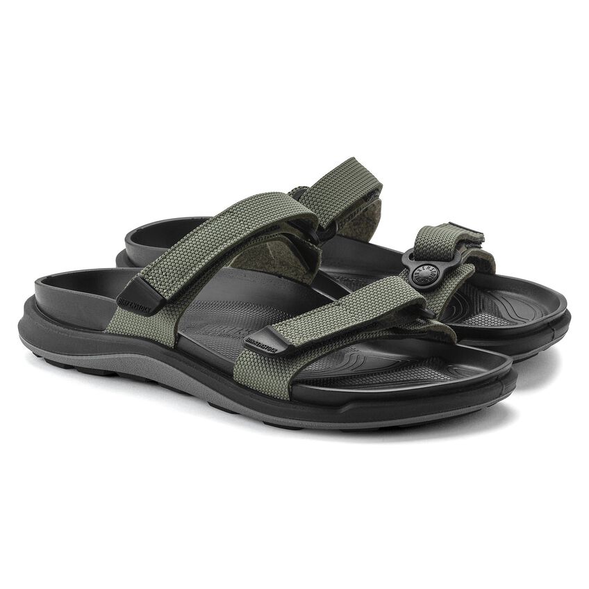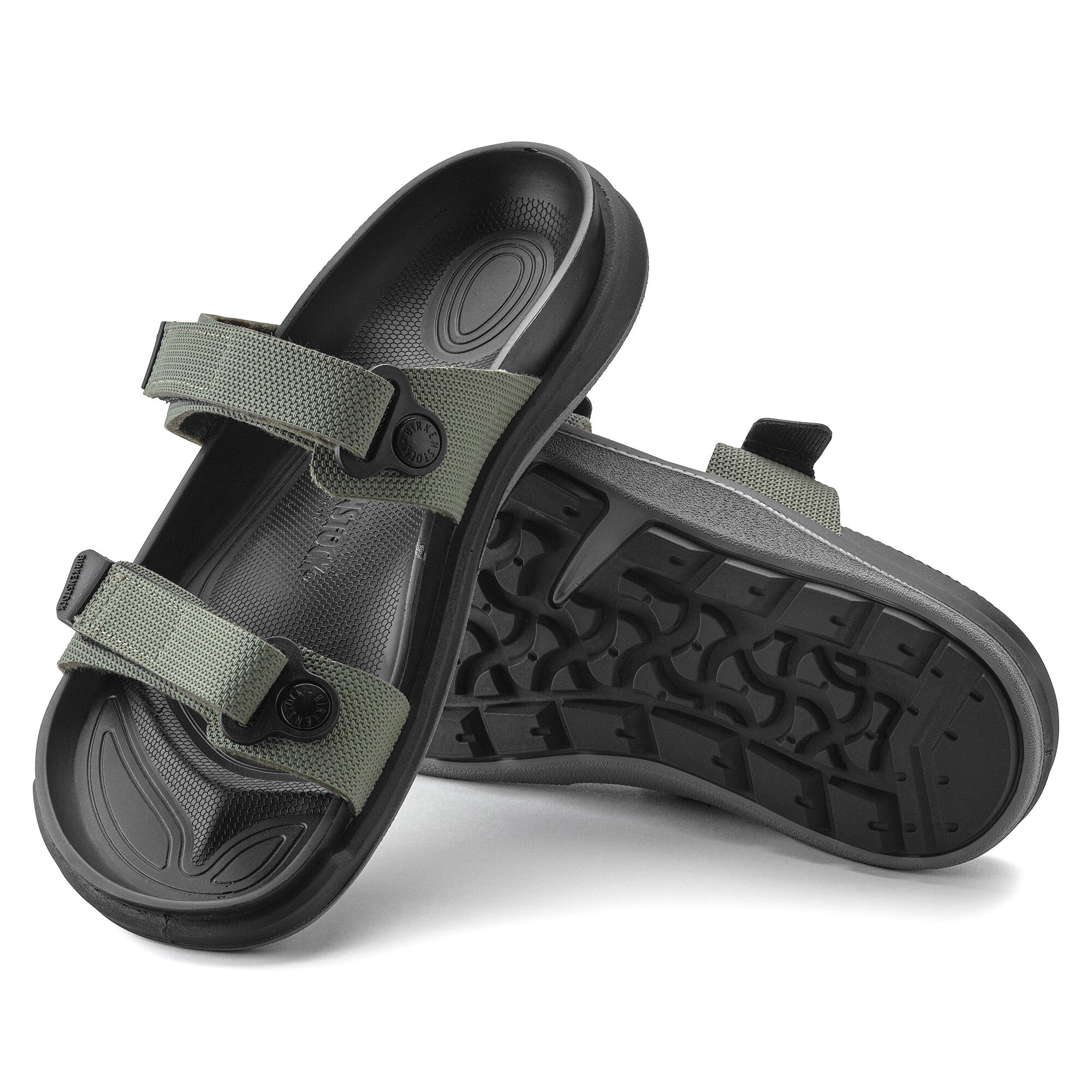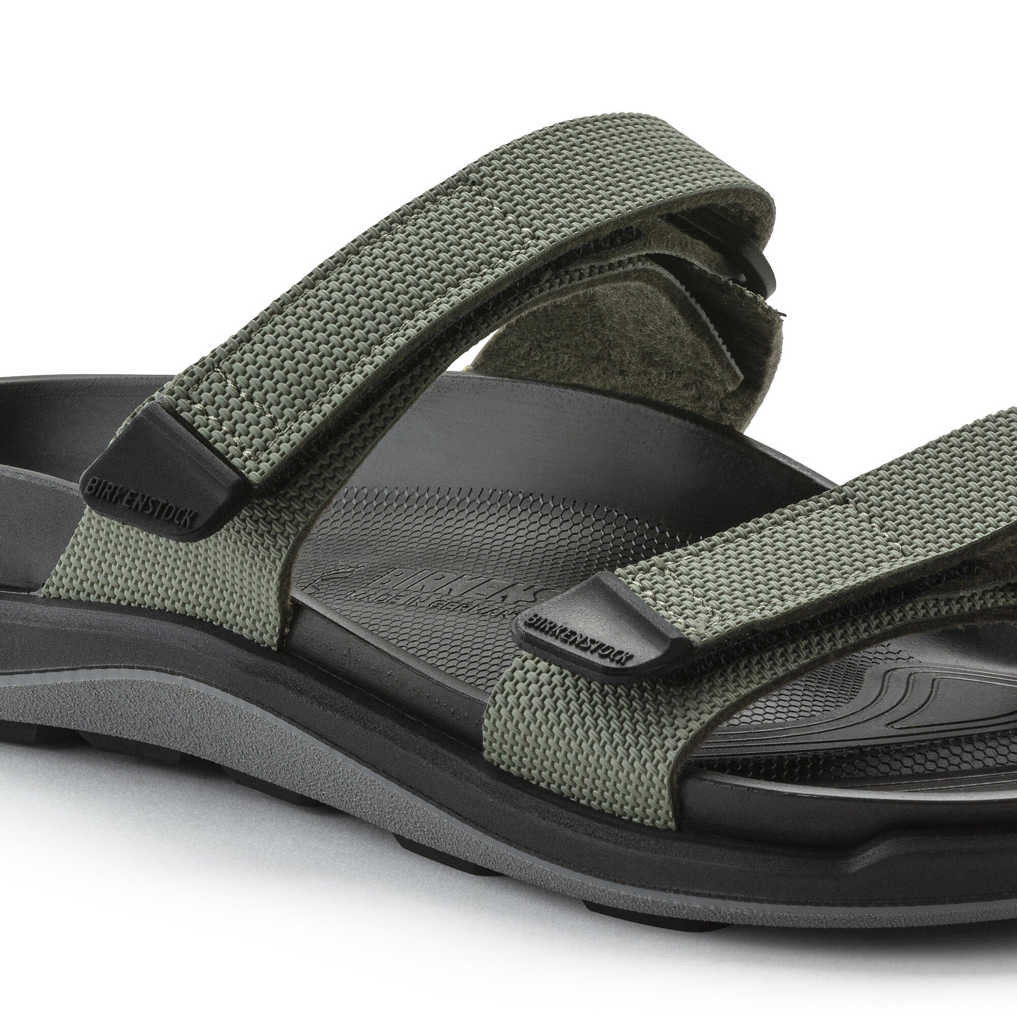 The BIRKENSTOCK Sahara is a variation on the classic Arizona and is the perfect sandal for anyone who is on their feet all day. The pin buckles have been replaced by hook-and-loop fasteners and the heel of the sole has been reinforced. Perfect for all active and adventurous BIRKENSTOCK fans. The polyurethane sole is affixed to the footbed in two layers and therefore offers maximum flexibility, grip and durability. The upper is made from the skin-friendly, hard-wearing synthetic material Birko-Flor® which was reinterpreted with a futuristic look.
