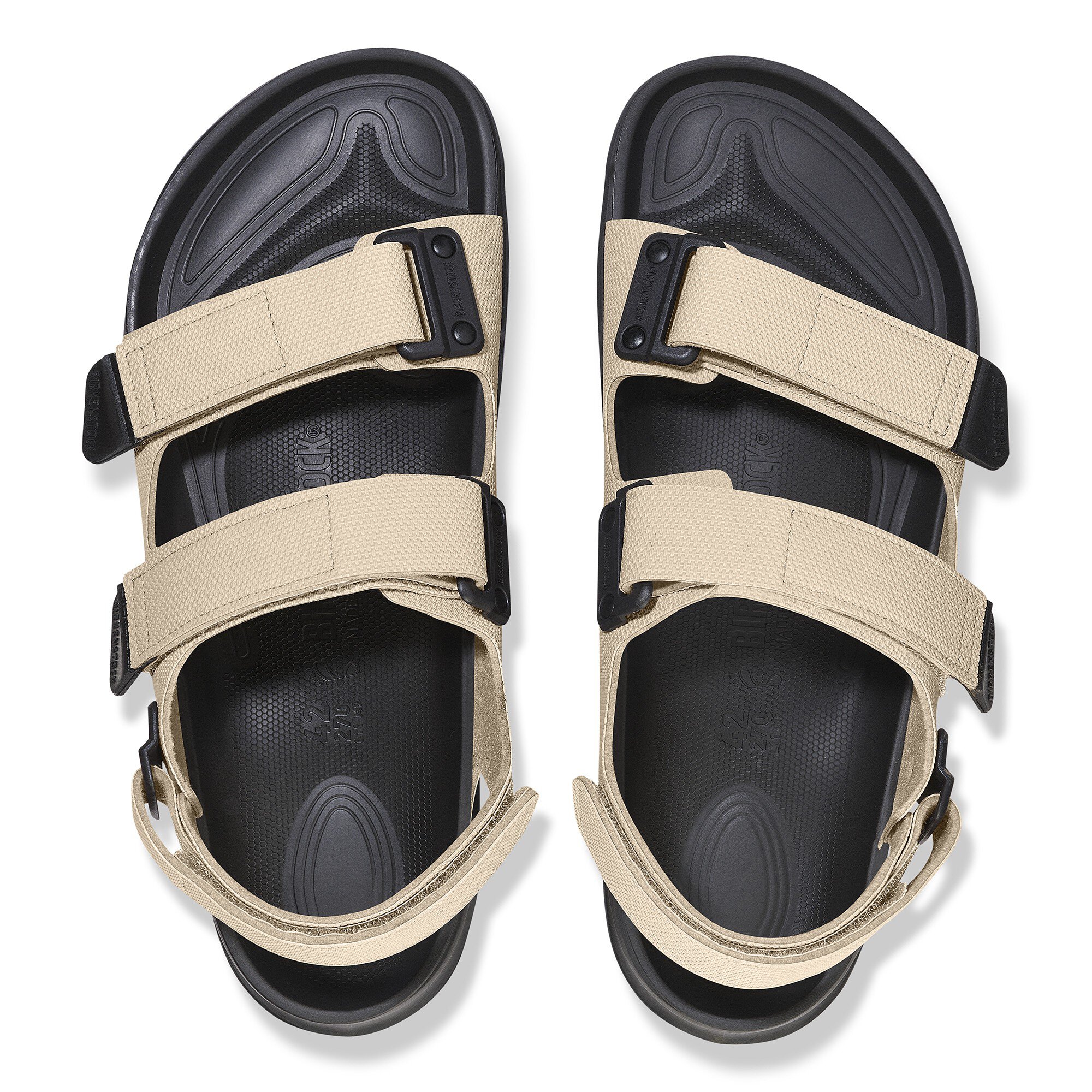 The BIRKENSTOCK Tatacoa is a variation of the classic Milano and is the perfect sandal for anyone who is on their feet all day. The pin buckles have been replaced by hook-and-loop fasteners and the heel of the sole has been reinforced. Perfect for all active and adventurous BIRKENSTOCK fans. The polyurethane sole is affixed to the footbed in two layers and therefore offers maximum flexibility, grip and durability. The upper is made from the skin-friendly, hard-wearing synthetic material Birko-Flor® which was reinterpreted with a futuristic look.