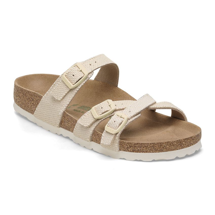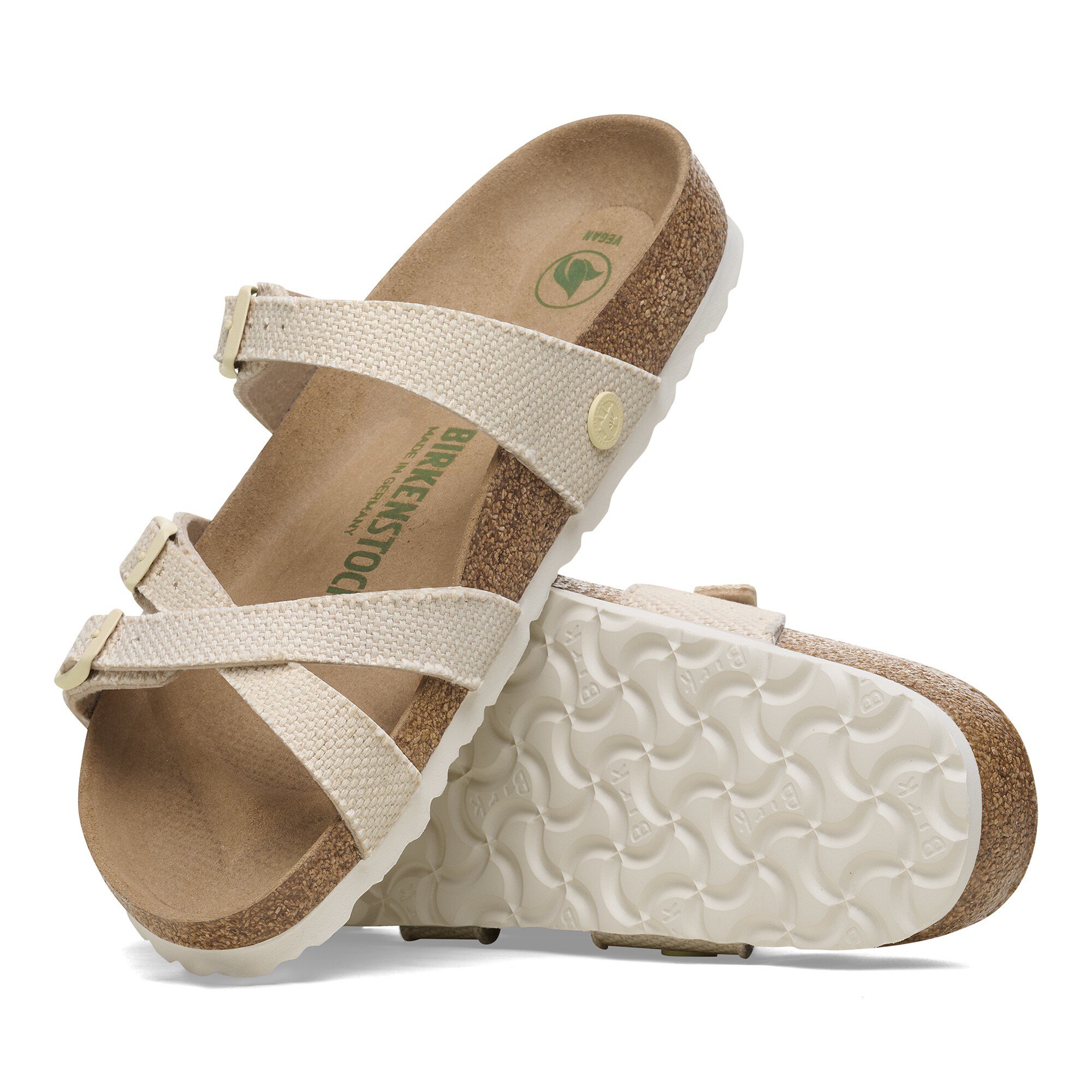 The BIRKENSTOCK Franca is a jaunty sandal with slim cross-over straps. This version boasts a natural canvas look. It has been given an update in a new material, with a vegan version now available. It is entirely free of animal products, as verified by independent testing laboratories. The color-coordinated details round off the shoe’s look of sophistication. The upper is made from smooth fabric.