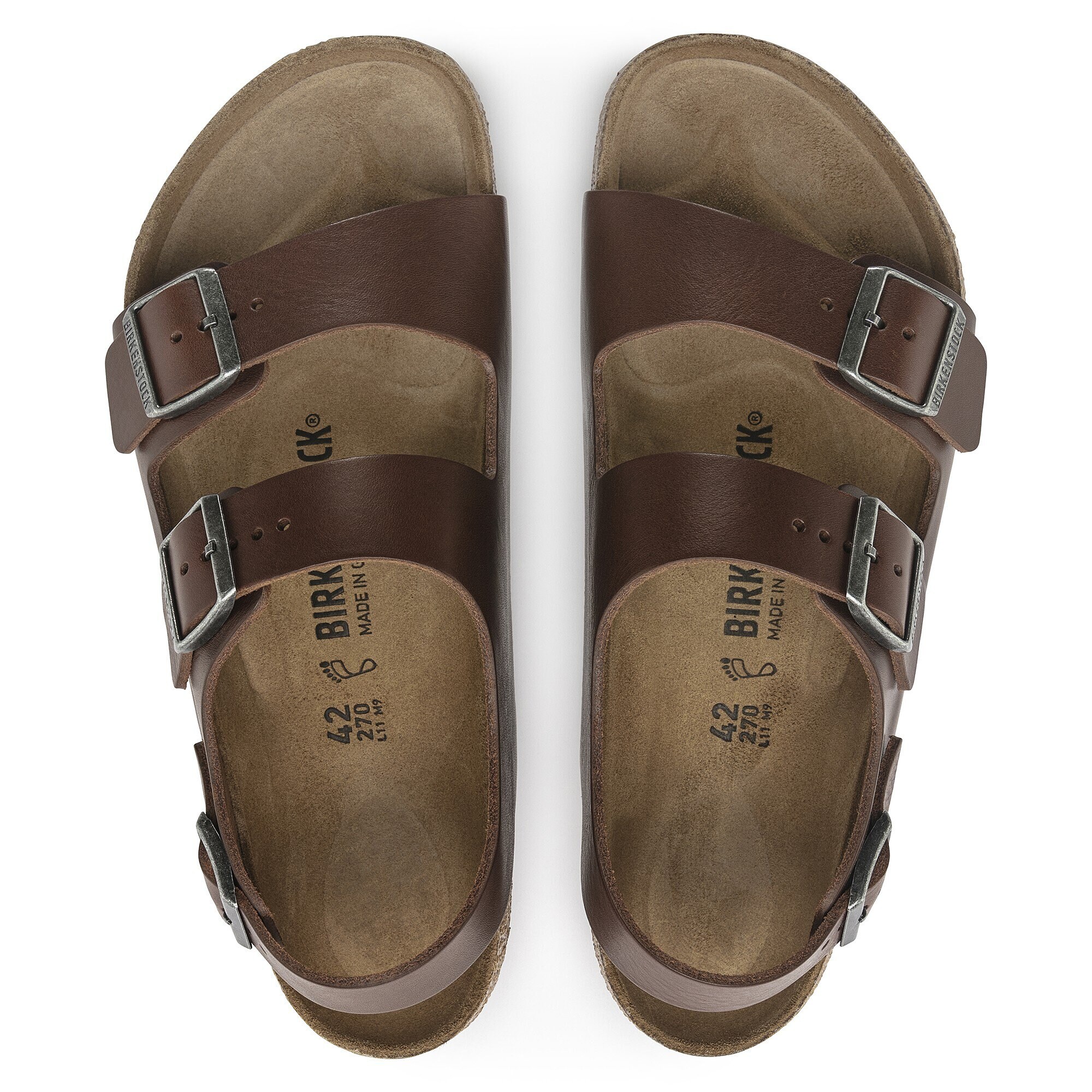 A leather look that can keep up. We outfitted the Milano with a unique rubber grip outsole and EVA midsole to give you enhanced traction and cushioning. High-quality, soft aniline leather revives traditions of leather goods manufacturers thanks to its unique surface texture. With an adjustable backstrap and original BIRKENSTOCK cork-latex footbed for the ultimate in all-day support.