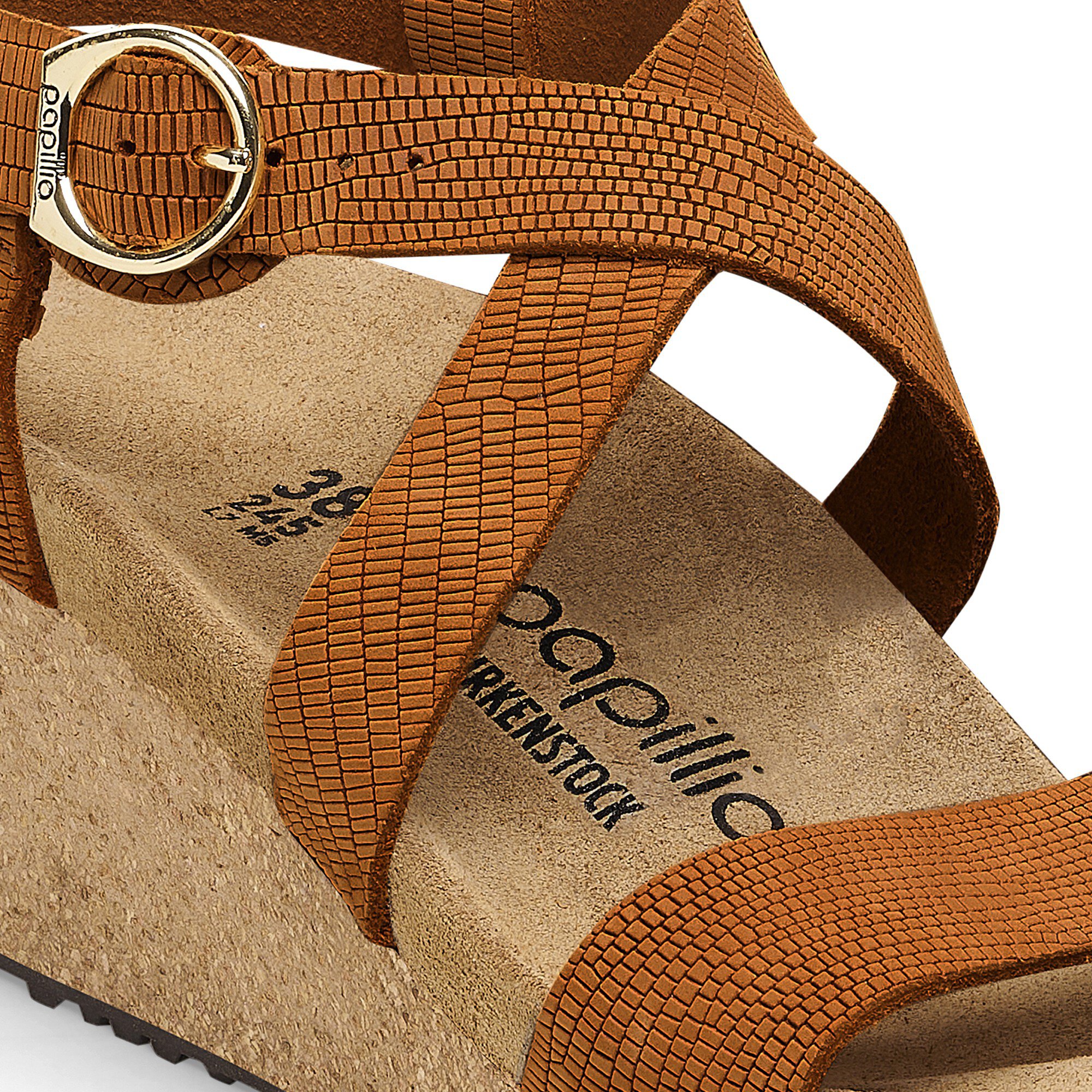 New from Papillio® by BIRKENSTOCK®. The Sibyl wedge levels up with comfort and ease, riding a wave of color that takes inspiration from sea and sky. Embossed leather straps crisscross comfortably across the foot, brought together by an elegant, rounded buckle. Lifted by a classic cork wedge, built around the contoured footbed you love.